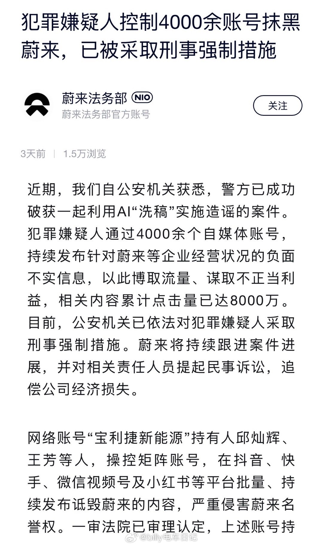 不错啊,蔚来法务部的公告也夹带“私货”了,不放过任何一个可以传播的渠道蔚来