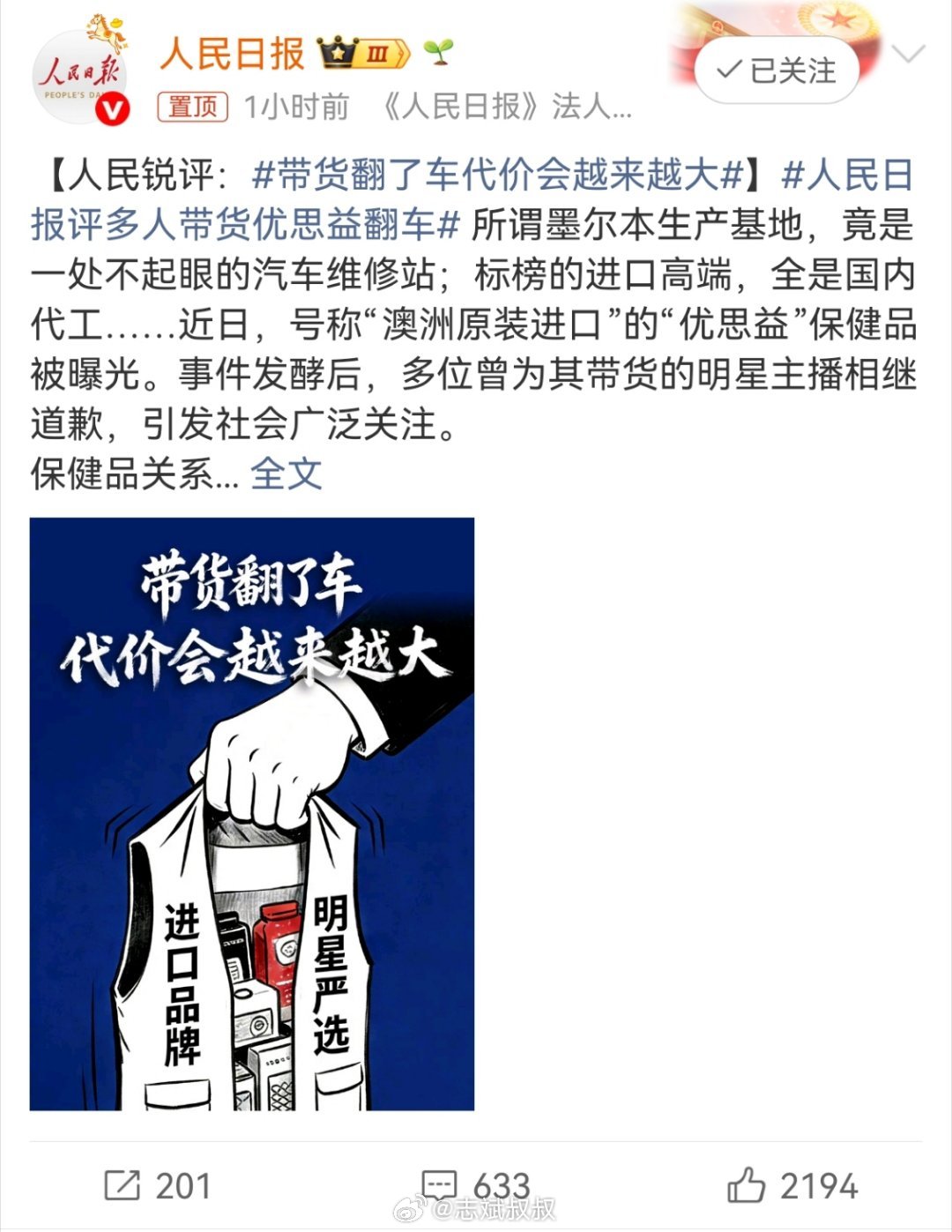 人民日报评多人带货优思益翻车这个优思益的保健品翻车,我觉得跟去年三只羊美诚月饼的事故是一样的,都是属于欺诈。