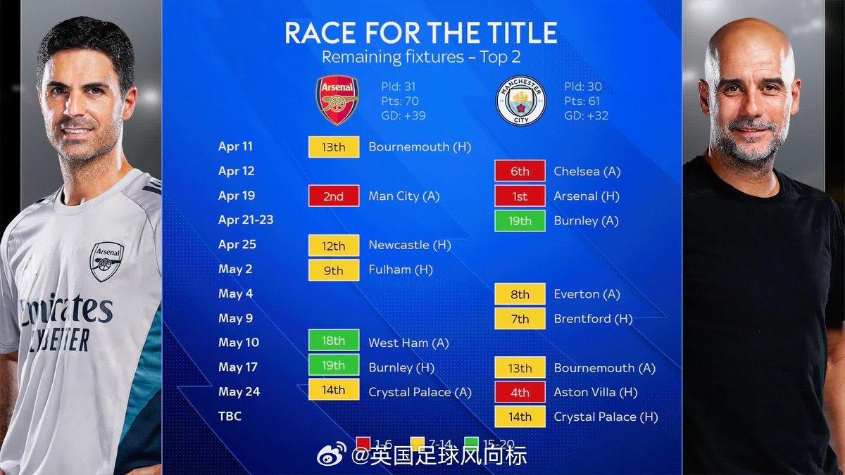 【阿森纳曼城争冠赛程对比】接连在联赛杯和足总杯遭遇挫折的阿森纳,本赛季的夺冠希望已经全部压在英超联赛上面,他们最后7场联赛的赛程(日期、对手排名、主客场等等)。曼城虽然近期走势强劲,但是他们最后8场比赛的困难度,应该比阿森纳更艰苦。