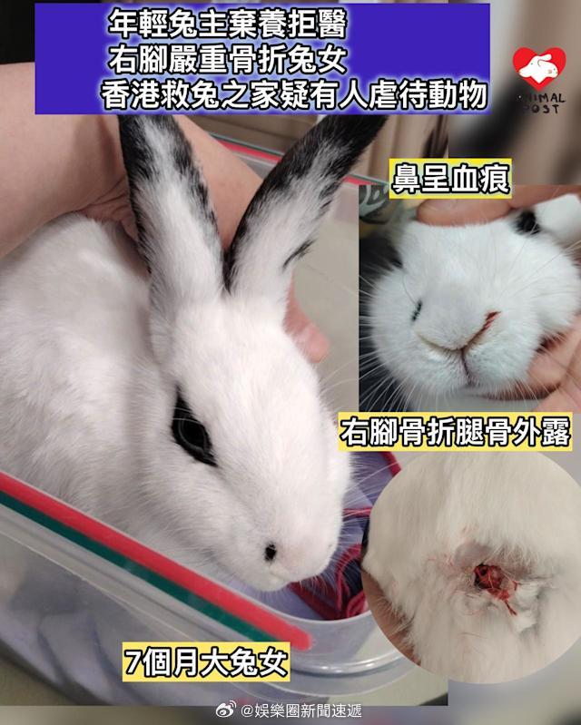 至於該兔兔只有7個月大,Alex 表示,兔兔右腿開放性骨折且沒有立即處理,所以最終只能截肢保命。而兔女身體虛弱,營養不良,身為家兔,骨瘦嶙峋,半點肉也沒有,嚴重貧血,X光顯示是粉碎性骨折,有部份骨更插出皮膚並外露造成的開放性骨折。Alex指,兔女如捱得過手術,應該適應後,不會有太大問題。因為他們兩年前也曾救過一隻兔都是5個月大左右截肢。他們現替兔女改名毛娘。他希望大家可以為兔兔集氣,希望她可以捱過這關,手術成功後可再尋家,重過一段新的生活。