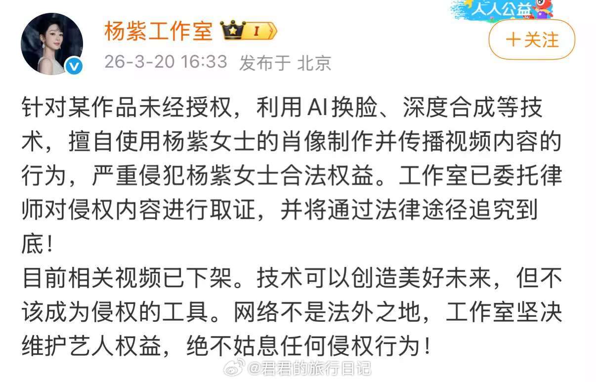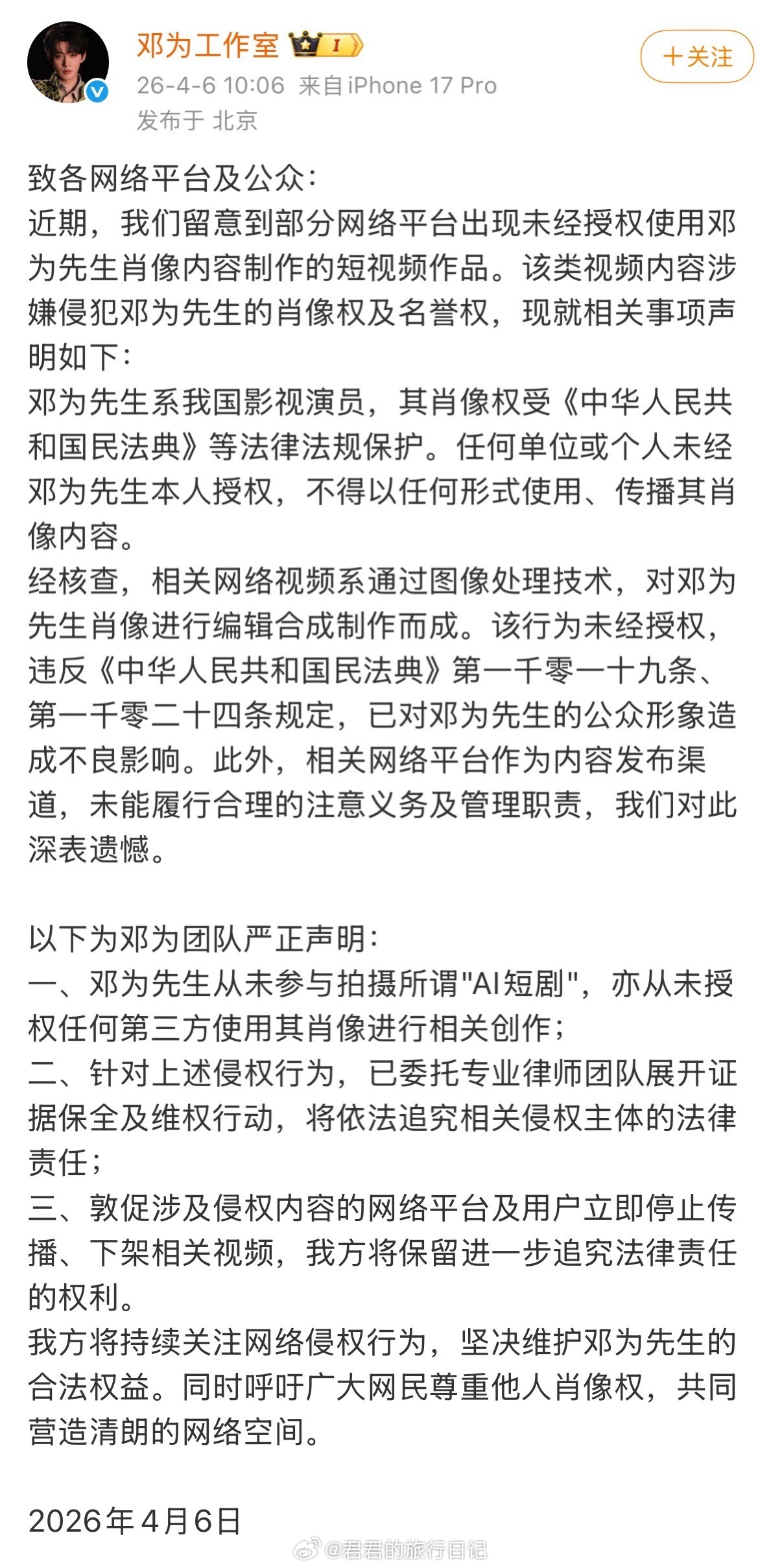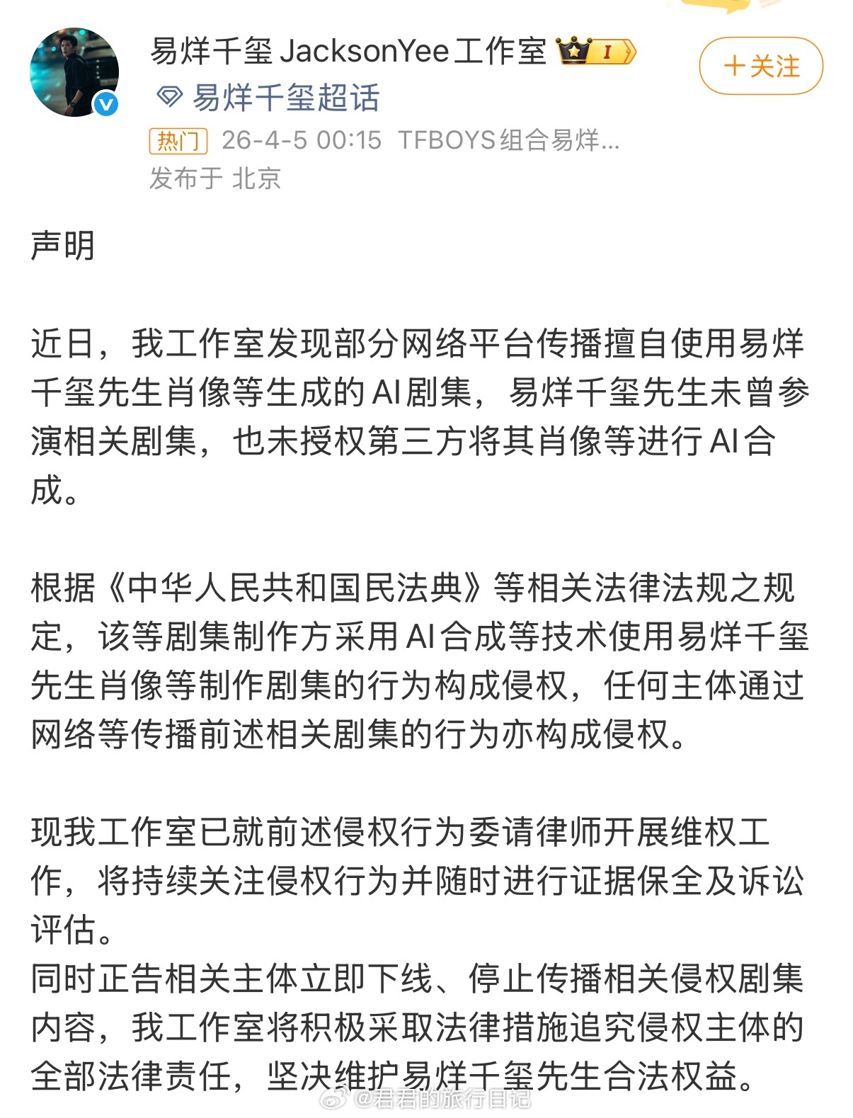 AI越来越无法无天了,好多明星都发声明,说有人用ai使用他们的肖像做短剧。