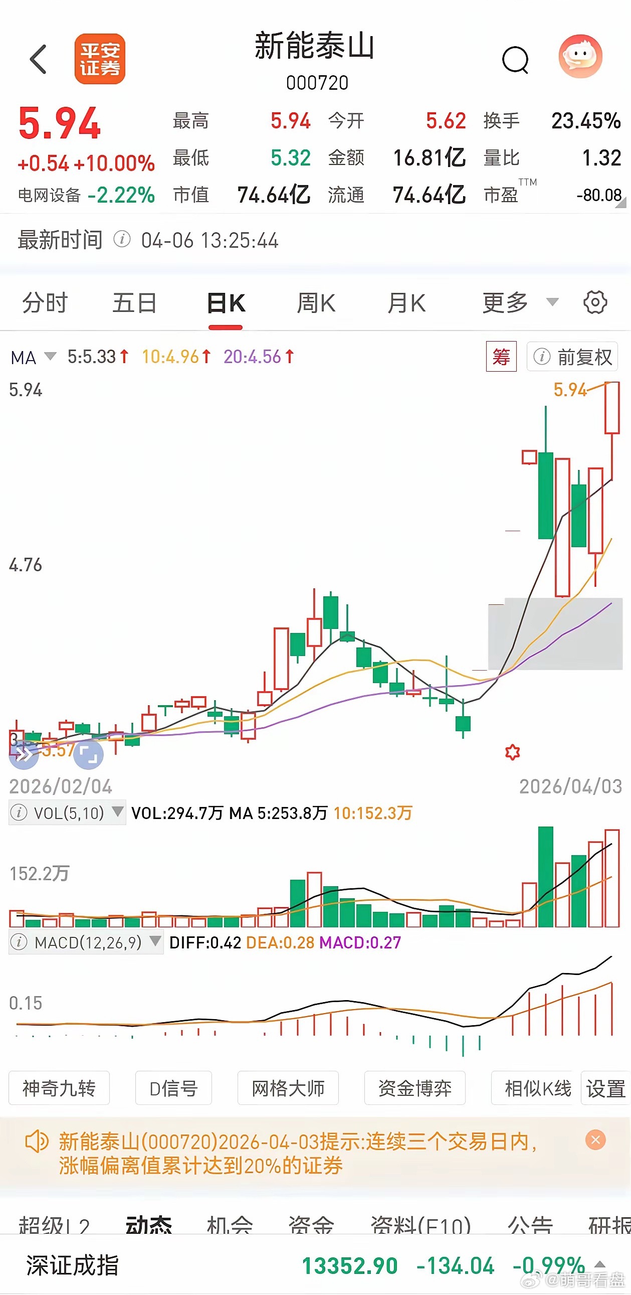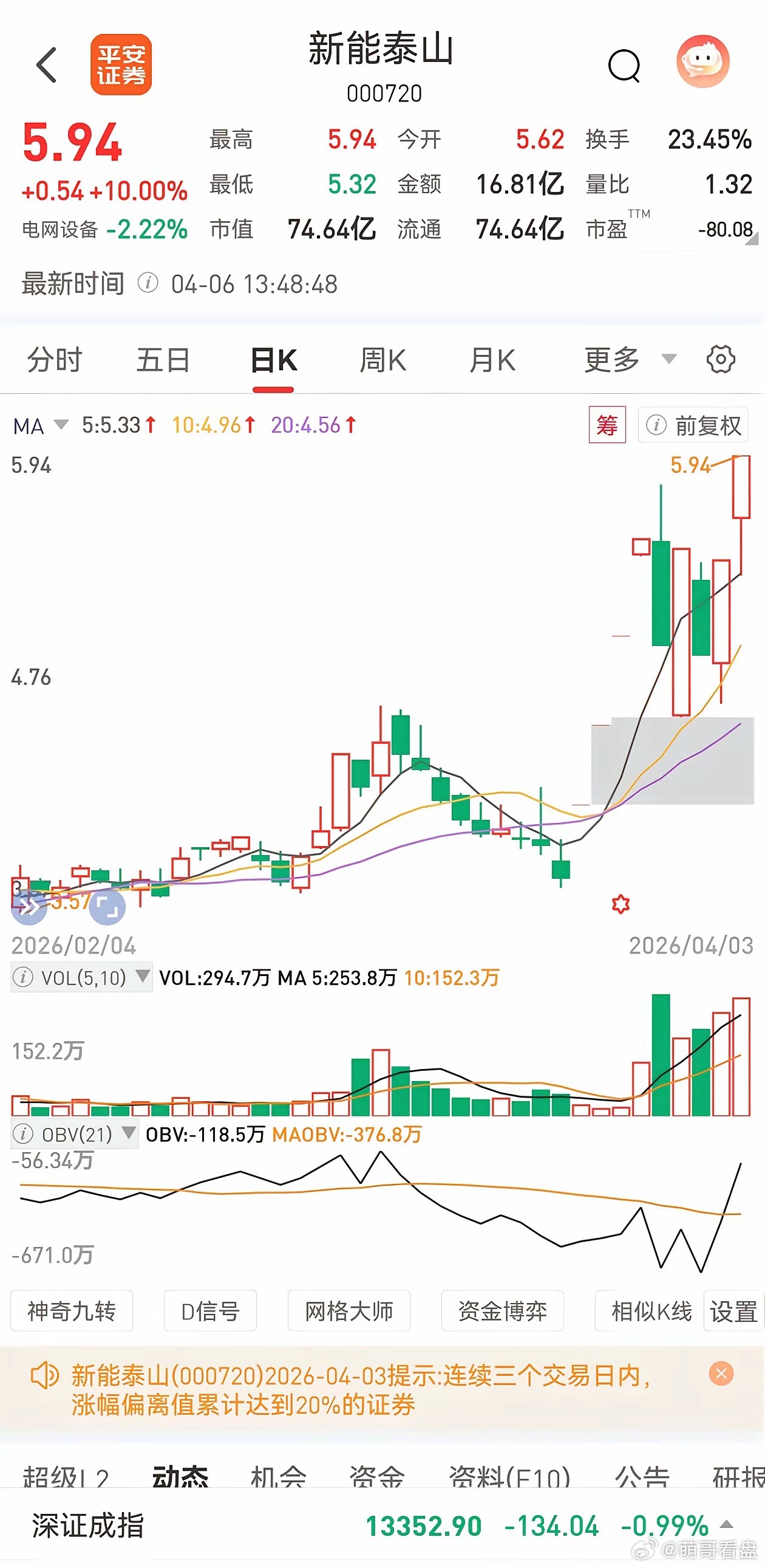 股票启动前的信号,清清楚楚!一个月内有涨停,然后洗盘。注意!快慢线一直在零轴之上。启动就四个涨停,直接暴力洗盘放量收绿,震荡,下午跌停。散户全跑了。隔天再次涨停。注意这里的换手率和量价关系,一直在合理的范围内。再次洗盘,下午跌停。同样没有放量。主力手法残暴凶悍。哪个散户拿得住?前天抄底进来的散户也跑了,再次两个带量的涨停。量能放大,主力应该是边拉边出货。重要的指标,快慢线 在零轴之上,RSI指标69.8,还没到80-90这个区间。obv更是现实资金持续流入。后面不会再给跌停板这样的机会了。拉高出货,直到筹码甩给大胆追涨的散户。再次大跌,就千万不要接了,第三个跌停板就是飞刀了,主力的最后一点筹码,会在跌停板上出货完毕。
