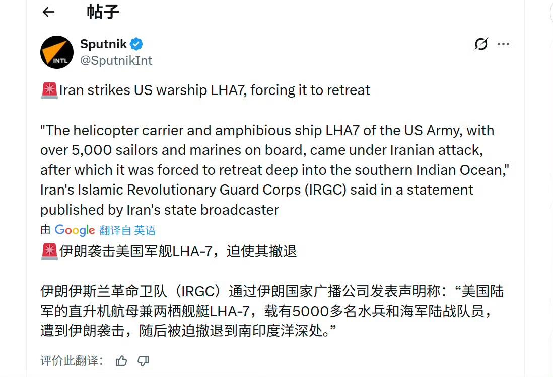 M军LHA-7“的黎波里”号两栖攻击舰(准航母)遭波斯导弹袭击,载5000余名官兵被迫撤至南印度洋深处。简单说:这不是一艘普通运输舰,而是M军在中 东的核心海上威 慑力量,相当于一个浮动的军事基地。如今却落得“仓皇逃窜”的下场。 M军至今集体沉默,既不承认也不辟谣,耐人寻味。这不仅是波斯反介入能力的大幅,升级,更是M军中东海上霸权的彻底崩塌。 。