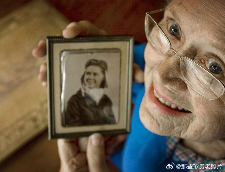 2009年6月19日的照片中,德克萨斯州奥斯丁的苏茜.贝恩拿着她本人1943年的照片,二战中她是女子空军飞行队(WASPs)的一员。贝恩是当时仍然活着的300名WASP成员之一,她们希望获得国会金质勋章的荣誉。