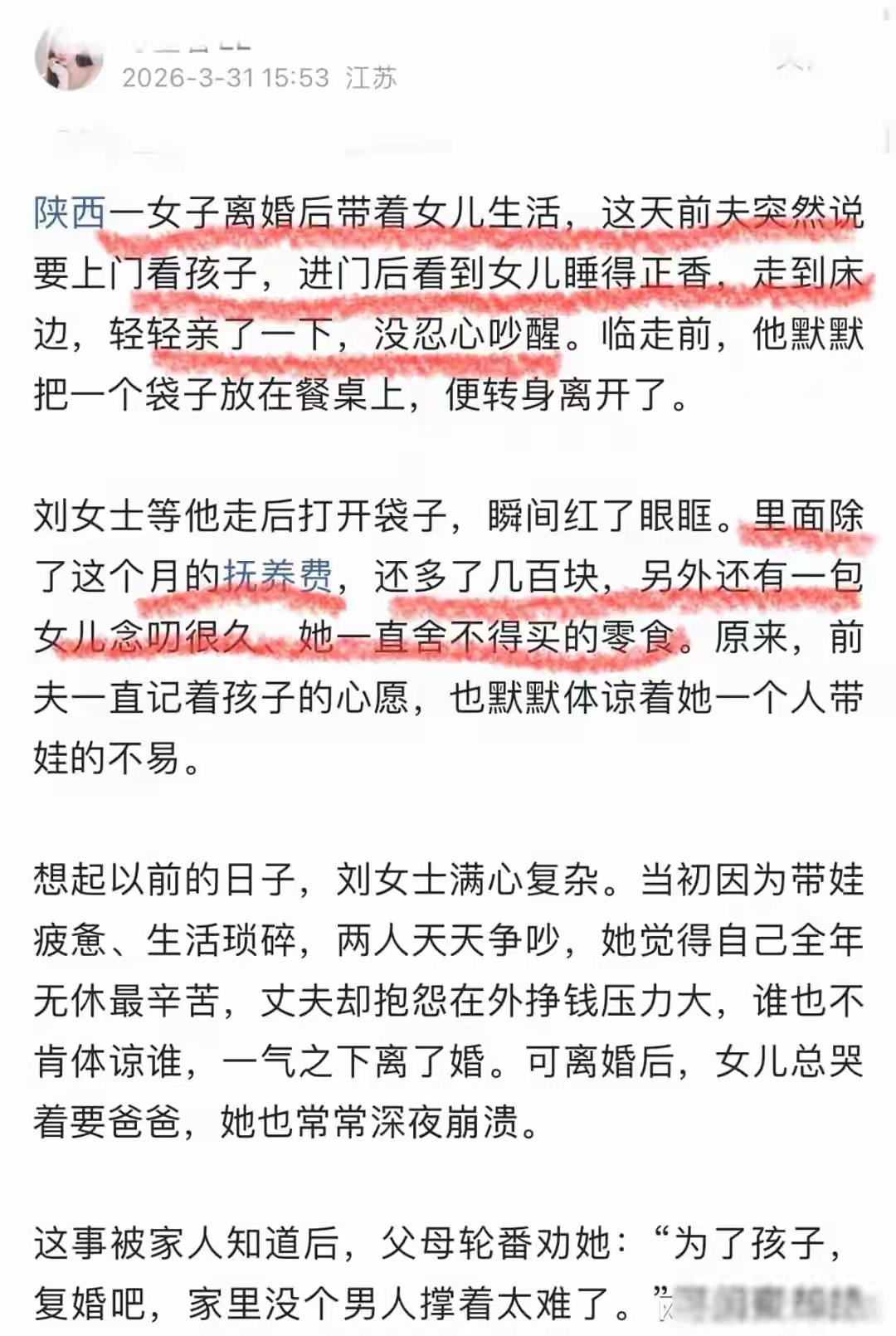 西安深夜一幕看哭全网:离异父亲潜入旧居亲吻熟睡女儿留下抚养费,单亲妈妈含泪追问该不该复婚 那张照片在深夜的朋友圈悄然传开。女孩熟睡的侧脸旁,整整齐齐叠着一沓现金,几包她念叨许久的薯片静静躺在枕边。三月十八日那晚,陕西刘女士的前夫就这样无声而来,未惊扰任何人,只留下一个轻吻、一笔抚养费与久违的零食,又默默消失在夜色里。 没有言语的碰撞,没有刻意的和解,一切安静得让人心头发酸。这叠钱不仅是当月的抚养费,更藏着一份未说出口的牵挂。薯片是孩子曾一次次期待却总被“下次”推远的愿望,如今被轻轻补上。原来有些人即使走出了婚姻,却从未走出父亲的角色。 刘女士的犹豫在夜色中蔓延。结婚三年,日子在带娃做饭的循环里消磨,丈夫的抱怨与她的疲惫像两堵墙,将两人越隔越远。没有背叛与暴力,只是琐碎日常一次次冲刷,最终冲垮了婚姻的堤坝。如今这幕温情,反而让她陷入更深的挣扎:该回头吗? 父母劝她复婚,说完整的家才是孩子的港湾;闺蜜却提醒,未解决的问题仍是暗礁。网友也争论不休——有人感慨“婚姻需要忍耐”,有人反驳“孩子不需要假装幸福的家庭”。这场无声的探望,竟掀起了千层浪。 其实这样的故事并非孤例。据2024年民政部数据,近七成90后夫妻离婚,主因是育儿压力、经济重担与沟通断裂。越来越多离异夫妻选择“合作式育儿”:杭州一对父母分居城东城西,却将接送孩子、分摊开支安排得清晰如课表。刘女士前夫的做法,正是这般沉默而踏实的担当。 但温情背后藏着隐忧。这一切全靠自觉,缺乏制度支撑。离婚冷静期过后,孩子生病谁签字、家长会谁出席、费用如何分摊,都成了模糊地带。法律未细说的空白,全靠人情填补。刘女士的感动是真的,恐惧也是真的——若某日温情褪去,是否又要重蹈覆辙? 这或许是我们时代的情感缩影:渴望温柔,却少了一份底气;期盼责任,却缺了一条退路。当婚姻的形式解散后,爱的内容该如何存续?每个人都在寻找答案。 或许真正的担当,不在于是否在同一屋檐下,而在于无论身在何处,都始终记得推开那扇门,放下那包薯片,和那个未完成的吻。 单亲家庭 离婚不离爱 情感抉择 (来源:根据民政部2024年数据及社会案例综合撰写)