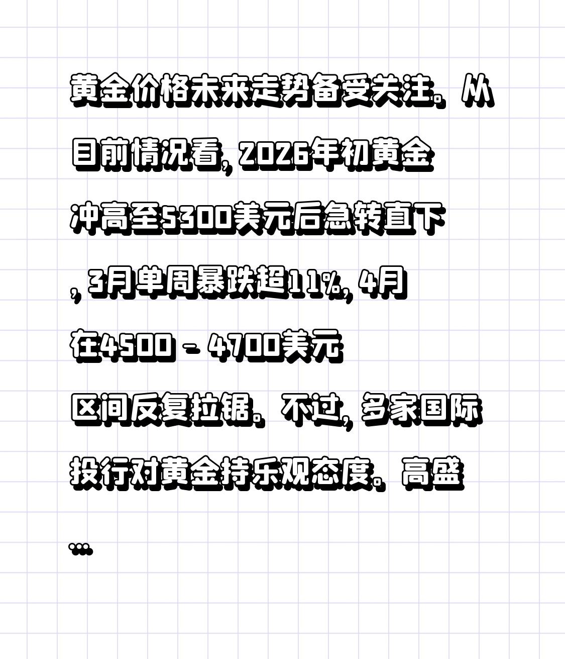 黄金价格未来走势备受关注。从目前情况看,2026年初黄金冲高至5300美元后急转直下,3月单周暴跌超11%,4月在4500 - 4700美元区间反复拉锯。不过,多家国际投行对黄金持乐观态度。高盛预计到2026年底金价有望升至每盎司5400美元,瑞银预计2026年黄金均价为5000美元,蒙特利尔银行预计2027年黄金均价有望突破5125美元,更有观点预测2026年金价有望突破6000美元。长期来看,央行持续“囤金”和美元信用弱化等因素,为金价上涨提供了坚实支撑,未来黄金价格有望突破5000美元/盎司,甚至冲击6000美元以上,只是上涨之路会伴随剧烈波动。