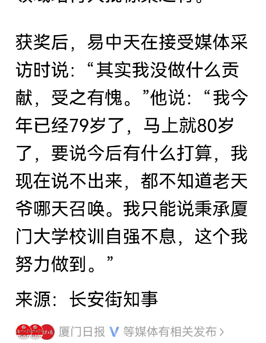 易中天凭啥能获奖? 大家都很惊讶,搜了一下厦大“南强杰出贡献奖”评选宗旨,说了四个方面:“在学科建设、人才培养、科研创新、社会服务等作出系统性、开创性贡献的杰出教师”。 这四个方面,因学校奖的是2025年度的,易在这一年的表现应该在“社会服务”作出了杰出贡献了,为啥?说“学科建设”他只当了一个挂名的院长;“人才培养”他就没有带学生;“科研创新”应该只参加了一些访谈节目。 唯有“服务社会”了,因为人家当编剧拍了《三国的星空》电影,并且亏几千万也要宣讲三国故事,宣传“曹操是个好同志”,厦大谁能做到这样“服务社会”?只有易中天有这个实力。 所以说易大师获奖是够条件的,另一个方面他这些年的巨大争议为厦大提高了知名度,管他的,黑粉也是粉。 看报道,易大师获奖后挺谦虚的,接受采访时说“没做贡献,受之有愧”,还有点自知之明。