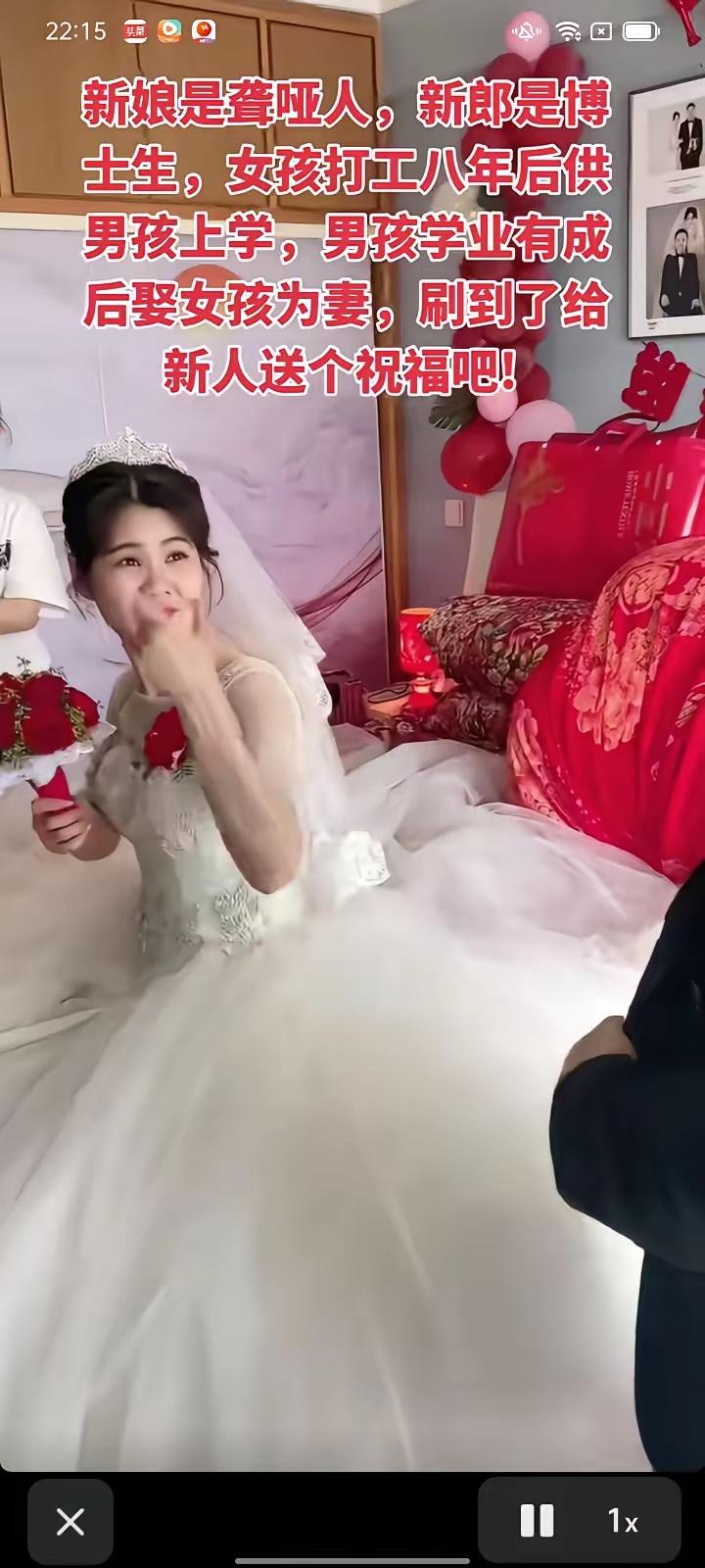 聋哑新娘苦守八年供博士丈夫读完书,婚礼现场他跪地痛哭:这辈子,我只做你的耳朵! 在这个快餐爱情盛行、多少人因为几两碎银便轻易走散的年代,一场特殊的婚礼刷爆了全网,让无数网友泪目破防。没有奢华的排场,没有炫富的豪车,却有着世间最珍贵的承诺与坚守。新娘是一位无法开口说话的聋哑女孩,而新郎则是刚刚斩获博士学位的精英才子。这段看似“不对等”的婚姻背后,藏着一段长达八年的血泪深情,更诠释了什么叫做“莫忘糟糠妻”。 故事的主人公叫小芳(化名),她出生在一个普通的农村家庭,命运对她并不公平,自幼失聪,世界对她来说是无声的。然而,上帝关上了她的门,却为她打开了一扇窗,让她遇见了那个改变她一生的男孩——阿强(化名)。阿强家境贫寒,但天资聪颖,是村里公认的读书苗子。两人青梅竹马,感情深厚。当阿强考上重点大学,随后又一路攻读硕士、博士时,高昂的学费和生活费成了压垮这个贫困家庭的最后一根稻草。 看着爱人因筹钱而愁白了头发,小芳做出了一个令所有人震惊的决定:她放弃了自己继续深造的机会,毅然决然地踏上了打工之路。那一年,她才十八岁。整整八年,两千九百多个日日夜夜,小芳在城市的喧嚣中沉默地奔波。她在餐馆洗过堆积如山的碗碟,双手被洗洁精泡得溃烂发白;她在制衣厂踩过缝纫机,常常为了赶工熬夜到凌晨;她做过保洁、发过传单,受尽了冷眼与委屈。每当累得直不起腰时,她就会拿出阿强的照片,用手语比划着:“他在读书,我要让他安心。” 这八年里,小芳把自己活成了一支队伍。她省吃俭用,把每一分血汗钱都寄给了远方的阿强。她从未抱怨过命运的不公,也从未向阿强诉说过自己的艰辛,只是默默地用柔弱的肩膀,扛起了爱人的梦想。而阿强也没有辜负这份沉甸甸的爱。他在实验室里通宵达旦,在书海中废寝忘食,心中始终燃烧着一团火:一定要出人头地,一定要让那个为他牺牲一切的女孩过上最好的生活。 终于,阿强顺利拿到了博士学位,成为了人人羡慕的高材文。面对繁华都市的诱惑和周围人“找个条件更好的伴侣”的劝告,阿强坚定地摇了摇头。他说:“如果没有她,就没有今天的我。我的军功章里,有一半是她的血肉。” 婚礼当天,现场没有司仪华丽的辞藻,只有真挚的情感在流淌。当穿着洁白婚纱的小芳缓缓走向舞台时,全场鸦雀无声。阿强看着眼前这个满脸沧桑却笑容纯净的女孩,瞬间红了眼眶。他大步上前,单膝跪地,紧紧握住小芳那双布满老茧的手,泪水夺眶而出。他在众人面前打着手语,一字一顿地表达着内心的誓言:“以前,是你用青春供养我的梦想;往后余生,我就是你的耳朵,就是你的声音。这世界再吵杂,我也只听得见你的心声。” 这一刻,所有的语言都显得苍白无力。小芳虽然听不见掌声,但她感受到了周围人祝福的温度,看到了丈夫眼中那份比金子还珍贵的坚定。这场婚礼,不仅仅是一个仪式,更是一次对人性光辉的礼赞。它狠狠地打了那些“上岸第一剑,先斩意中人”的负心汉的脸,证明了真正的爱情,从来都与身份、地位无关,只关乎良心与感恩。 网友们纷纷在评论区留言:“这才是真正的门当户对,精神上的门当户对!”、“男孩没有忘本,这样的男人前途无量,因为他懂得知恩图报。”、“女孩用八年青春赌了一个未来,幸好,她赢了!”、“看得我泪流满面,愿天下有情人终成眷属,愿所有真心都不被辜负。” 是啊,最好的爱情是什么?不是花前月下的浪漫,而是你陪我东山再起,我许你一世安稳。是在你最落魄时我不离不弃,在我最辉煌时你依然是我唯一的挚爱。阿强和小芳的故事告诉我们,无论时代如何变迁,真诚、善良和感恩永远是人性中最闪耀的光芒。 在这个浮躁的社会里,我们需要这样的故事来温暖人心,需要这样的榜样来唤醒良知。让我们共同祝福这对新人,愿他们的未来充满阳光,愿这份跨越无声世界的爱,能够天长地久,成为世间最美的传说。如果你也被这份真情打动,请转发出去,让更多人看到爱情的模样,给这对新人送上最诚挚的祝福吧!聋哑少女 助学聋哑女孩