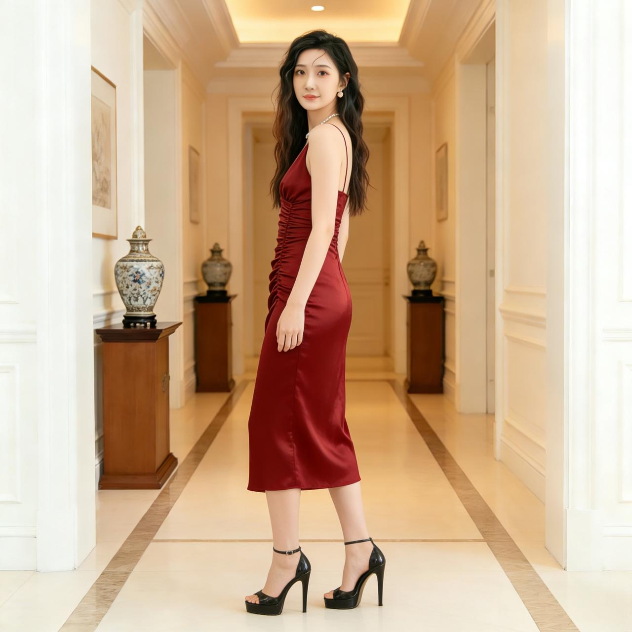 风情万种的女人是什么样的? 别追求外流了,这才是国风潮流! 风情万种,绝世佳华! 酒红色V领抽褶缎面连衣裙, 外搭一件挺括有型的黑色皮质西装外套, 酷飒与妩媚兼具; 造型干练又不失女人味,气场全开。