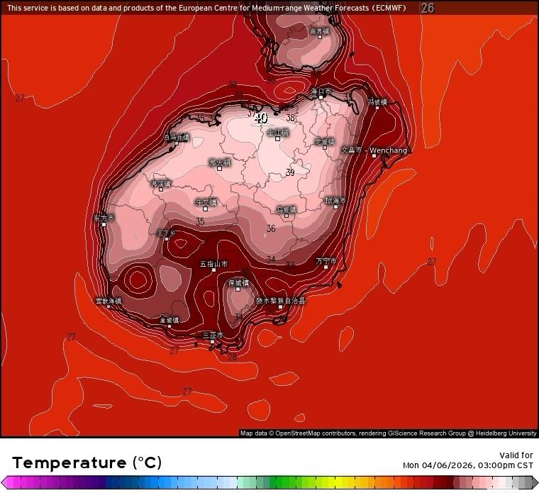 海南要连续一周40度左右了,海口也可能到这温度。副高加上前期少雨、干热风,把温度