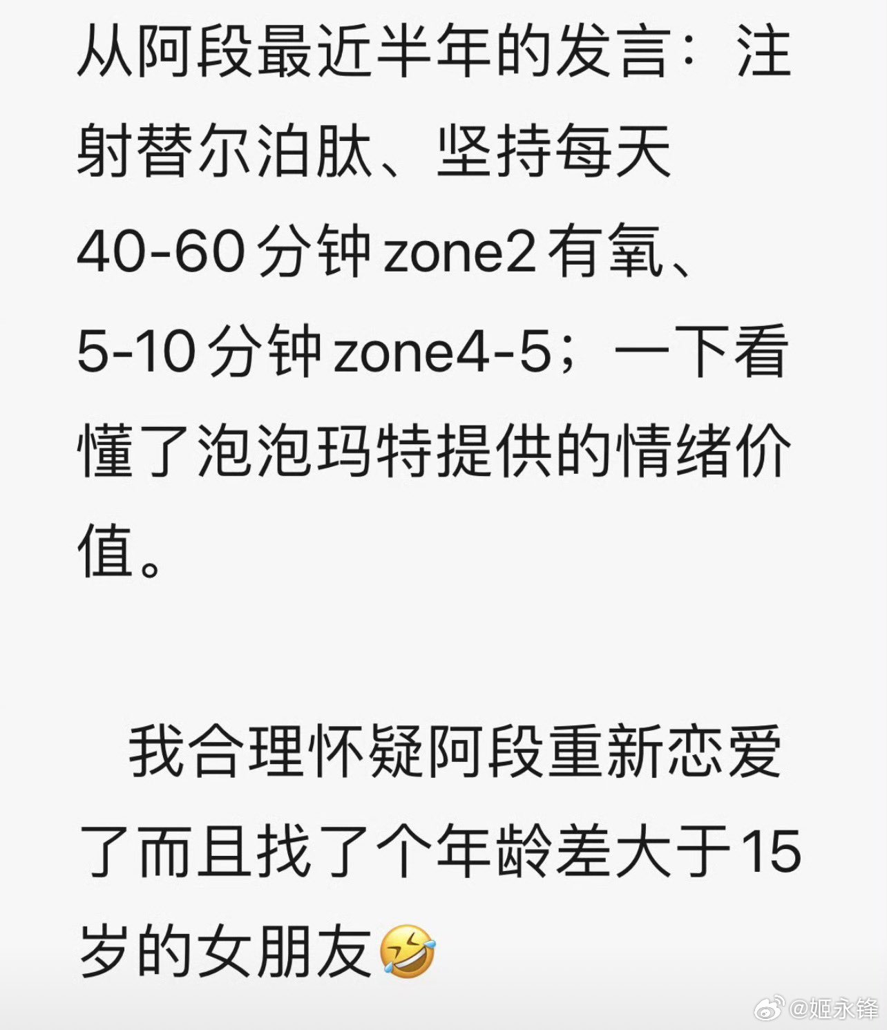 不过,段永平最近半年的发言引发新一轮猜测:他透露自己注射了替尔泊肽,坚持每天做40-60分钟的zone2有氧运动,外加5-10分钟的zone4-5高强度训练;还说看懂了泡泡玛特提供的情绪价值。于是,有理由怀疑段永平真的恋爱了❤️,而且对方是一位年龄差超过30岁的女朋友。