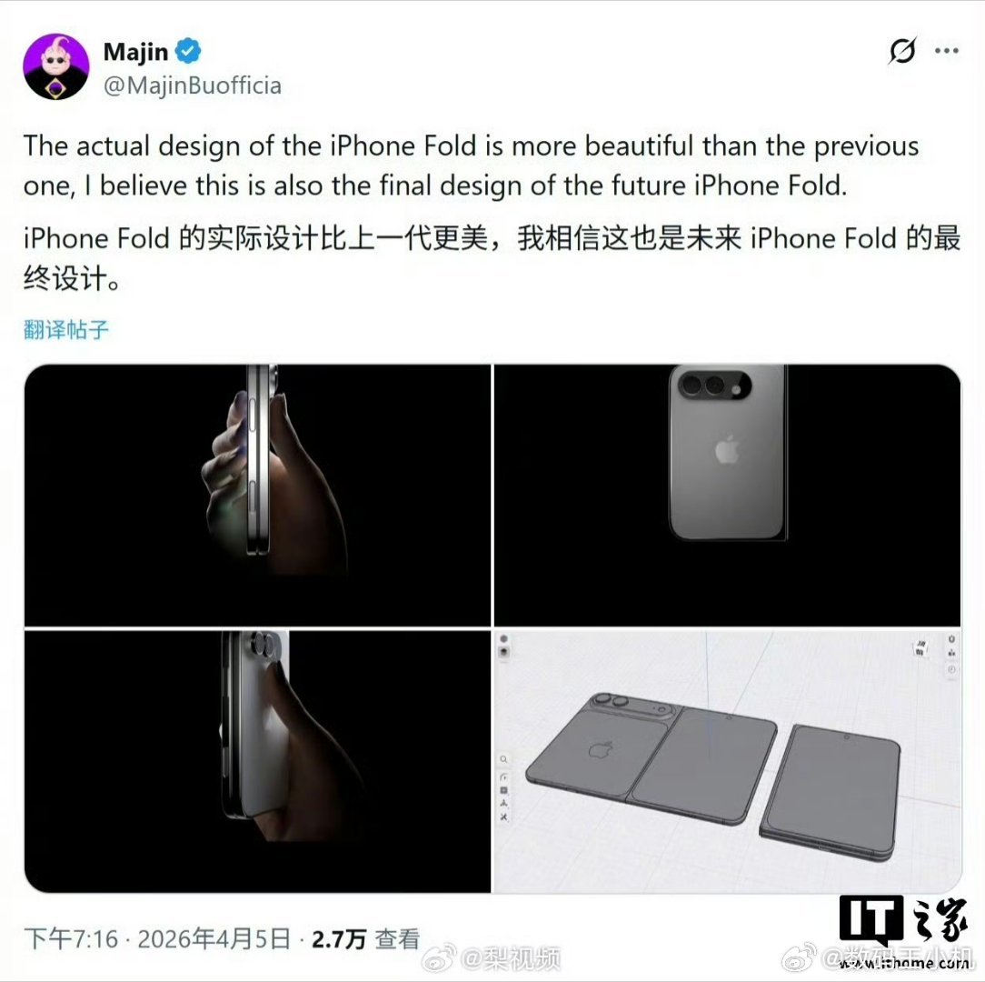 iPhoneFold再曝渲染图千呼万唤始出来,苹果首款折叠屏就长这个样子了↓,大小适中,女孩子拿应该也很轻松,我比较关心的是折痕和铰链寿命,还有影像会不会缩水,如果能保证有Pro系列的影像表现,那可就闭眼入了