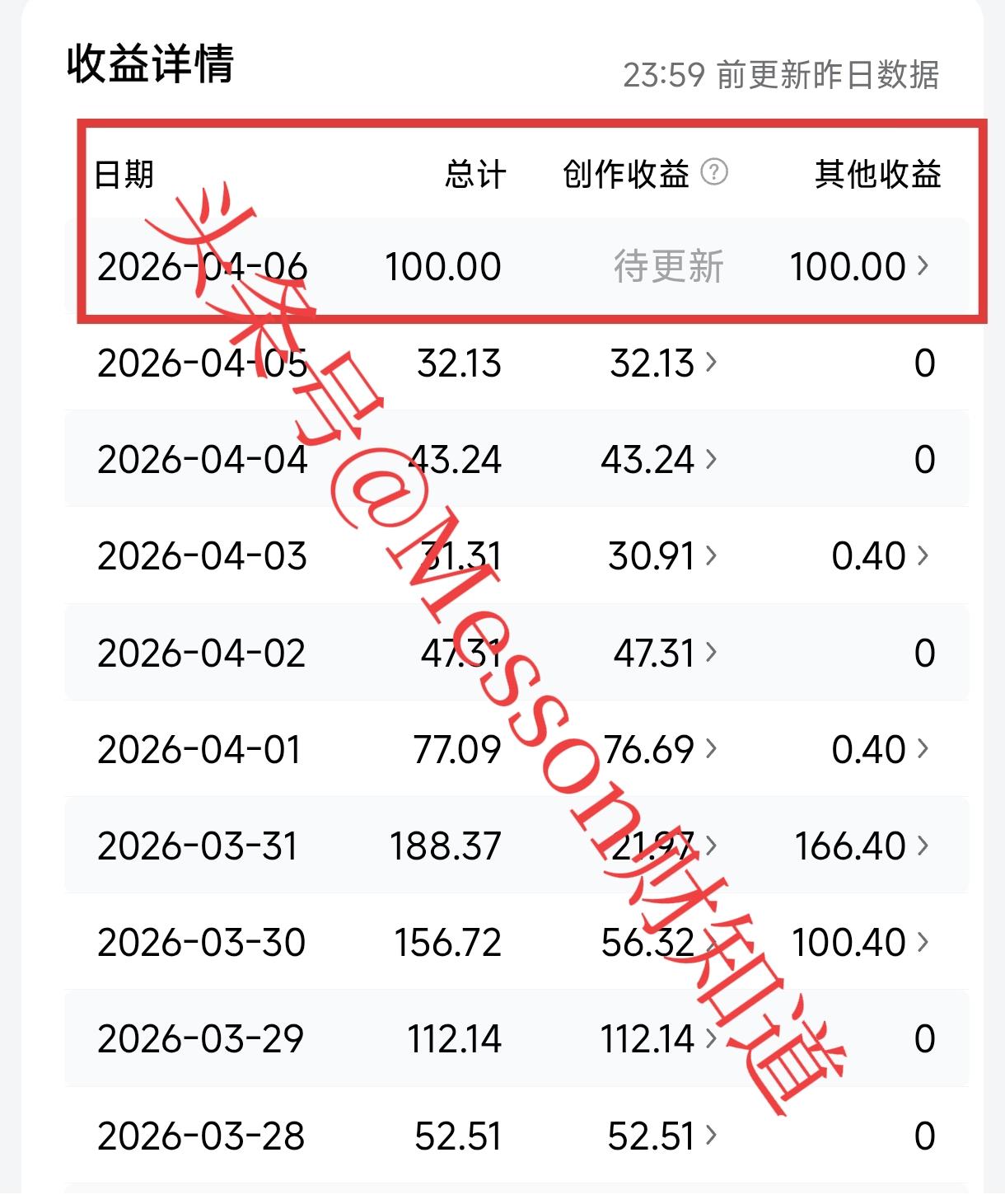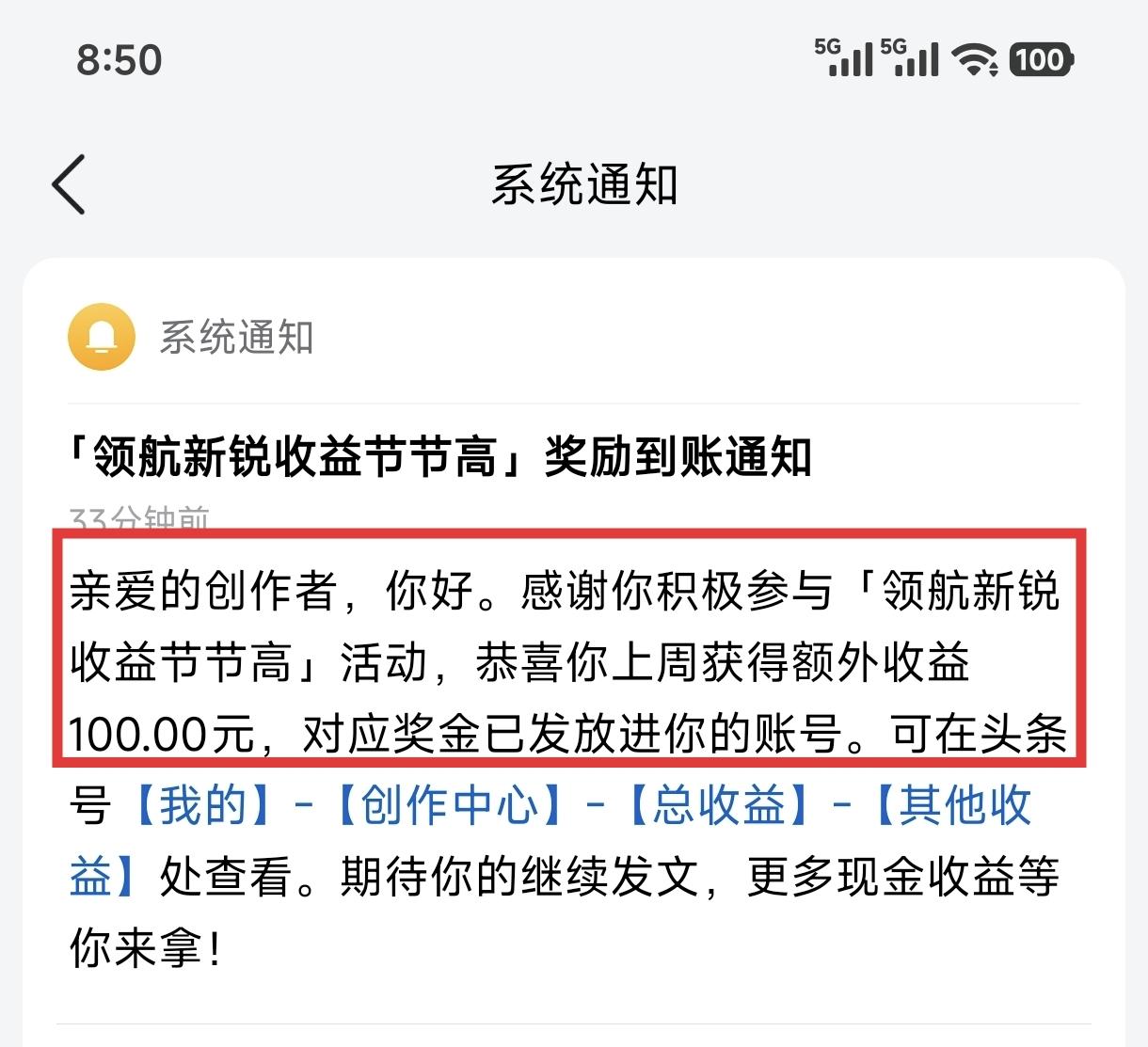 清晨八早的,打开头条看到了领航新锐收益节节高活动的额外收益100元,这不就是传说中的天上掉馅儿饼吗?今天早餐高低得加个茶叶蛋了,这不算奢侈吧? 上一周(截至5号)的总阅读量毛估估应该有30万左右,那么享受的额外收益就是“基础分成翻2倍(最高100元)”。新的一周再接再厉,争取达标(阅读量目标15万~30万)。 衷心感谢条友支持,欢迎互动交流[比心][点亮平安灯]