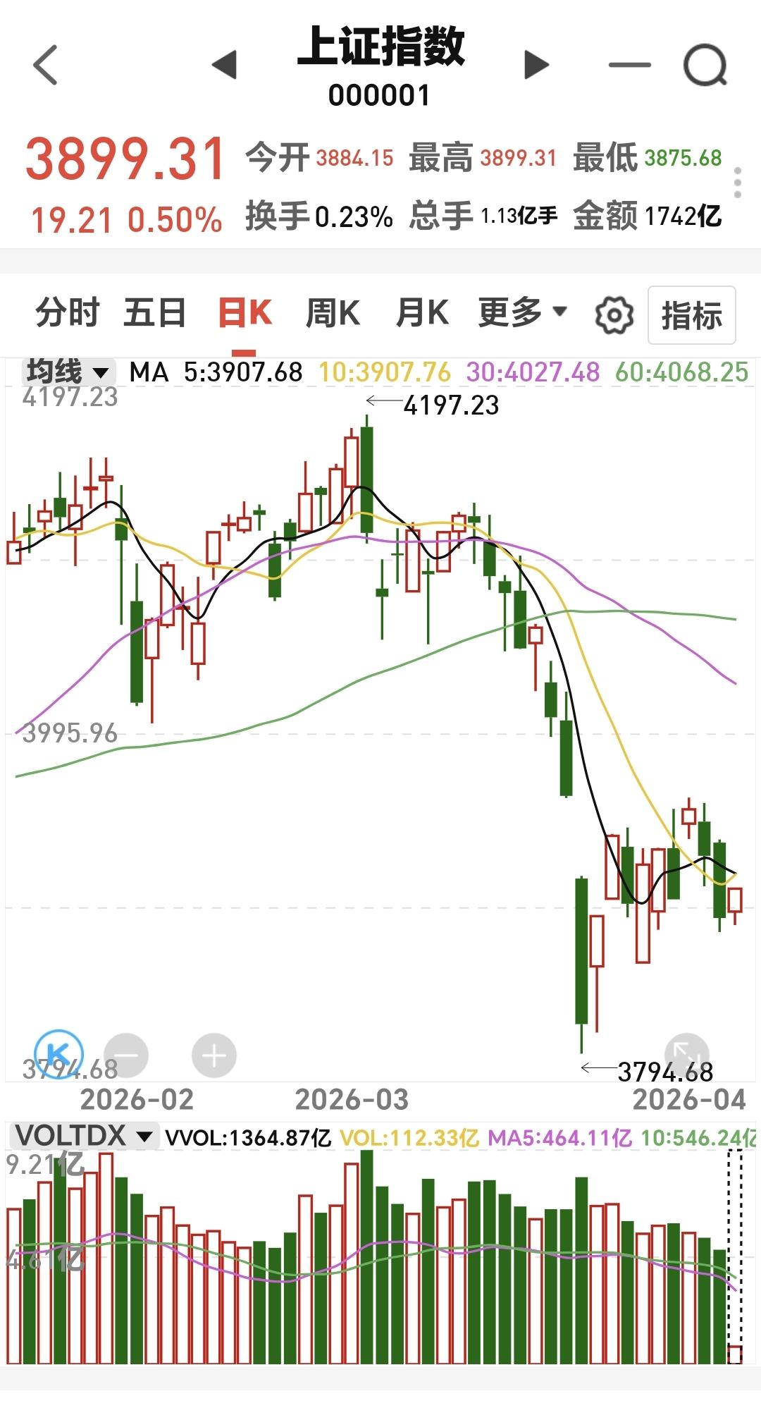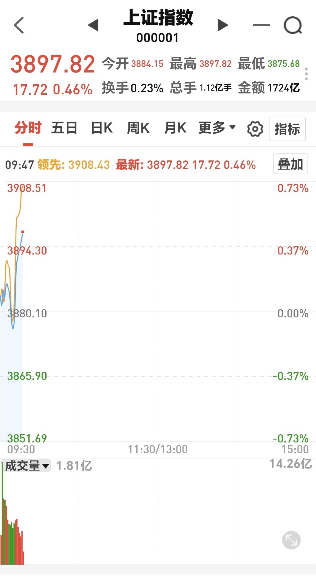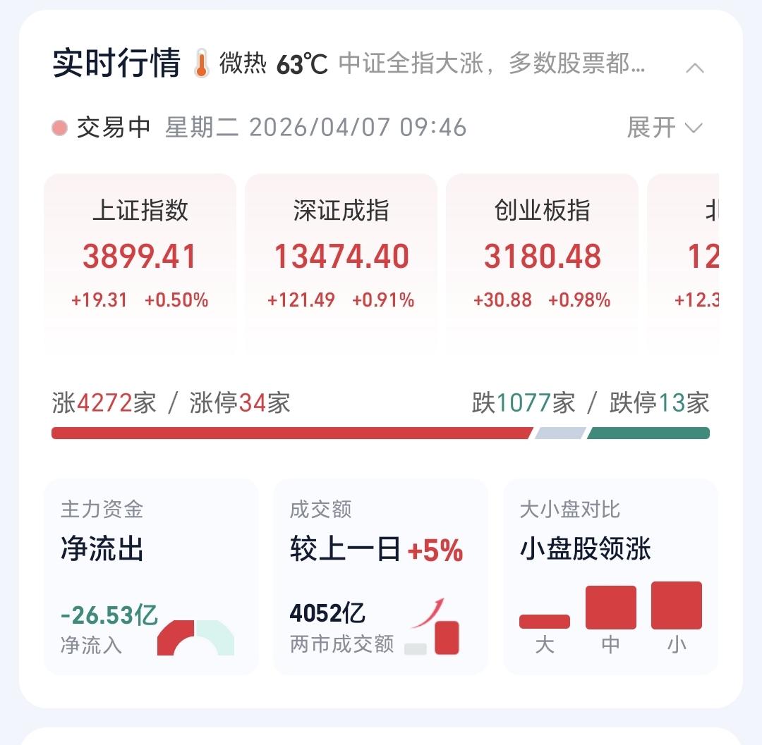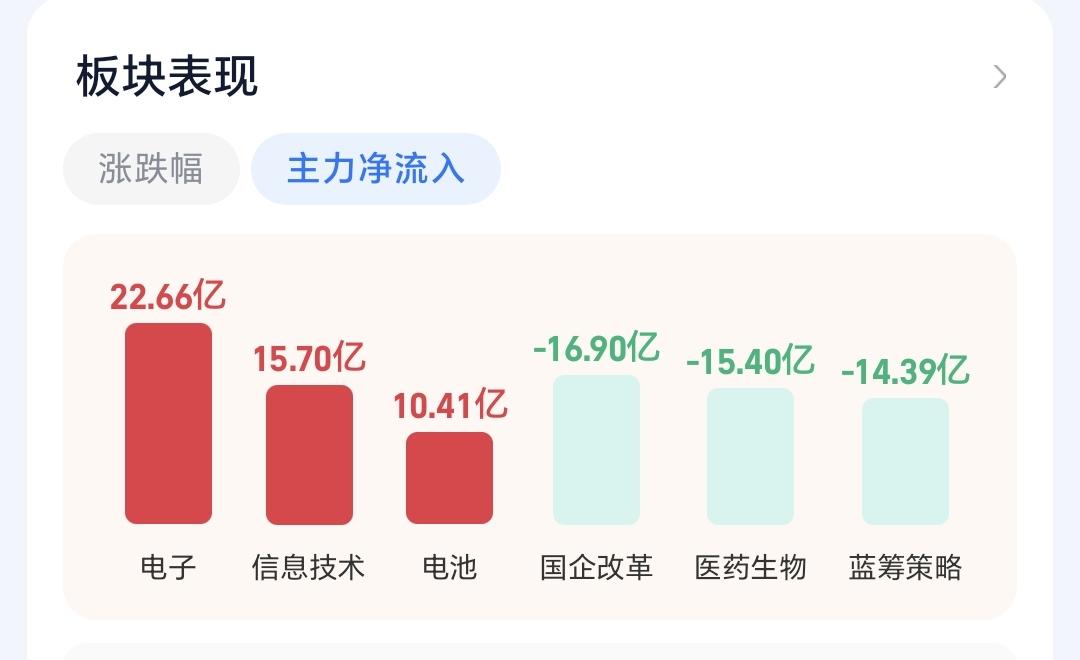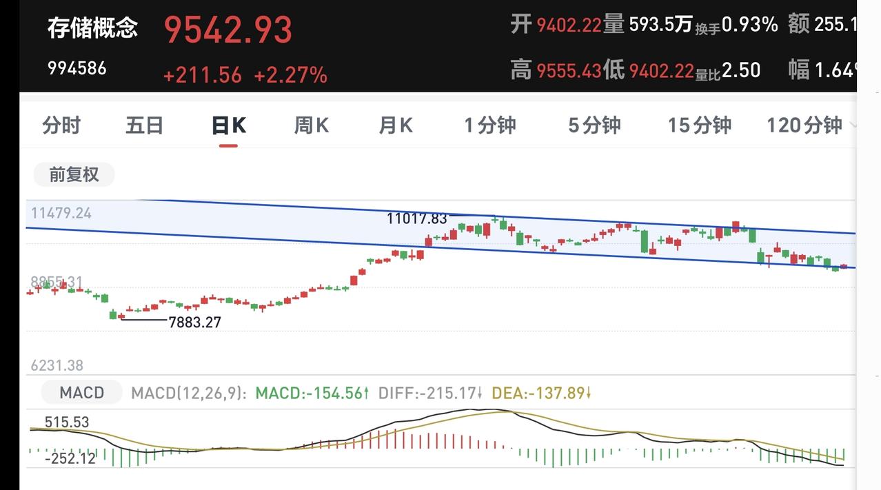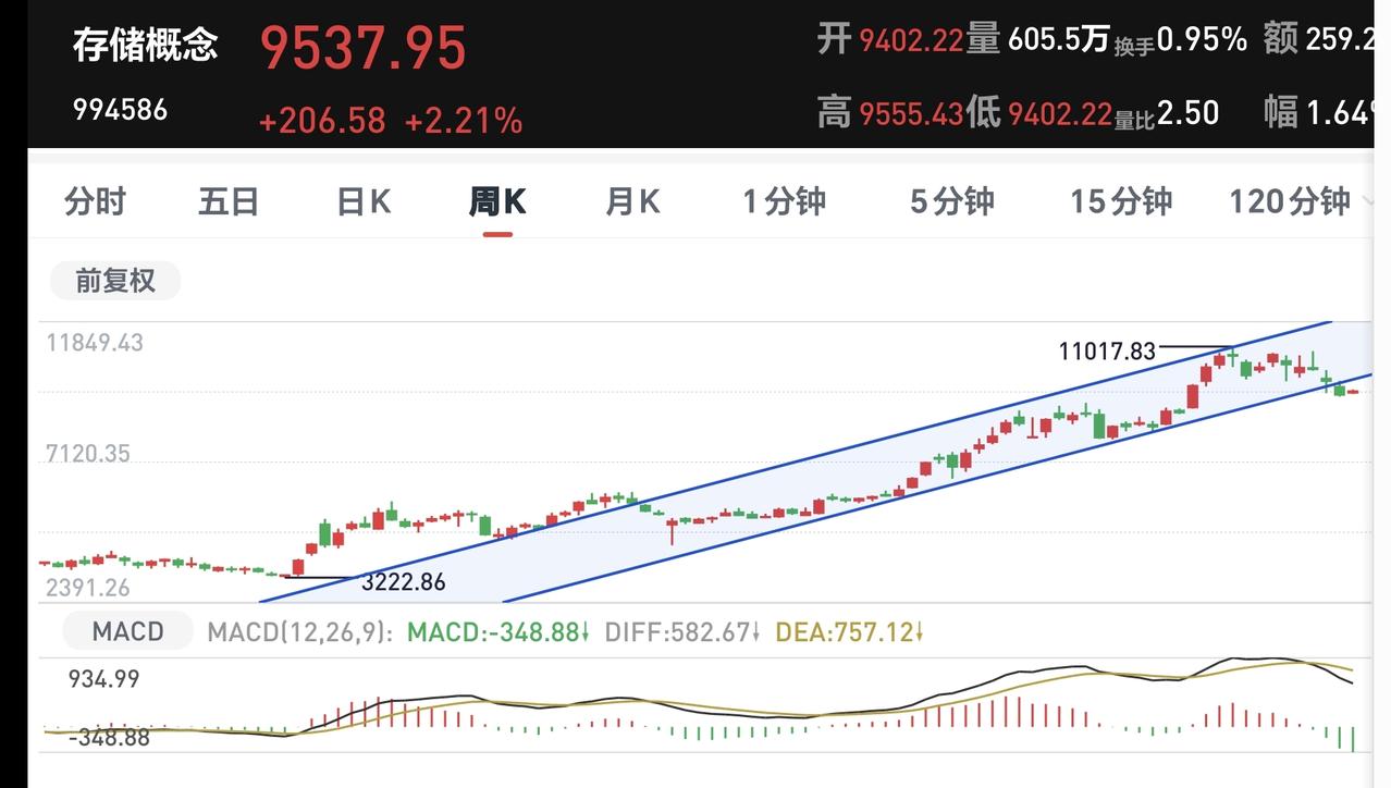 基金:存储概念大涨,是不是已经反转 今天市场高开,三大指数都是高开,创业板指开盘上涨了0.42%,开于3162点,上证指数开盘上涨了0.10%,开于3884点。 开盘以后指数小幅度震荡向上,黄色线在蓝色线上方,两条线之间的敞口还不小,这样的情况之下,今天的盘面不要过分担心,除非黄色线和蓝色线之间的敞口缩小,甚至是黄色线下穿蓝色线。 两市累计成交4052亿,相比于昨天同期放量了5%,市场上涨4272家,下跌1077家,上涨家数超过了下跌家数,涨停34家,跌停13家,主力资金净流出26亿,今天虽然是放量的,但放量的幅度只有5%,这样的放量幅度。不支持市场有大幅度上涨。 整个市场主力资金净流入最多的三个板块是:电子板块,信息技术板块,电池板块,主力资金净流出最多的三个板块是:国企板块,医药生物板块,蓝筹策略板块。 整个市场上涨幅度最大的三个板块是:存储芯片板块,固态电池板块,化工板块,下跌幅度最大的三个板块是:创新药板块,恒生科技板块,医药板块。 持有基金现在盘中估值上涨了1492元,盈利金额最大的三个板块是:芯片半导体板块,先进制造板块,创业板指,亏损金额最大的三个板块是:创新药板块,海外互联网板块,大消费板块。 存储概念今天大涨,但它的日线级别处于下跌通道中,上周五下跌跌破了这个下跌通道的下轨线,今天的上涨又回到了这个下跌通道内,今天的上涨并没有改变这个板块日线级别的下跌趋势,短线持有的人继续注意风险。 存储概念板块上周下跌跌破了周线级别上涨通道的下轨线,今天的上涨并没有能够重新回到这个上涨通道内,还是处于周线级别上涨趋势破位中,长线持有的人也需要注意风险,还没有看到任何反转的迹象。 现在盘中5天线位置是3907点,盘中最高3902点,并没有能够突破五天线的位置,继续观察能不能突破并站稳五天线,在突破并站稳五天线之前都是弱反弹,真正的强反弹是要突破并站上上周五盘中最高3929点,到现在为止的盘面走势并不能让我们乐观,还需要继续观察。 我写文章请大家过来欣赏,许多人看了以后,什么痕迹都没有留下,走的时候也是一声不吭,连一个点赞,连一句评论都不会留下,走的是那样的无声无息,这样的人是不地道的,没有做人最起码的准则,我不愿意与这样的人交朋友。