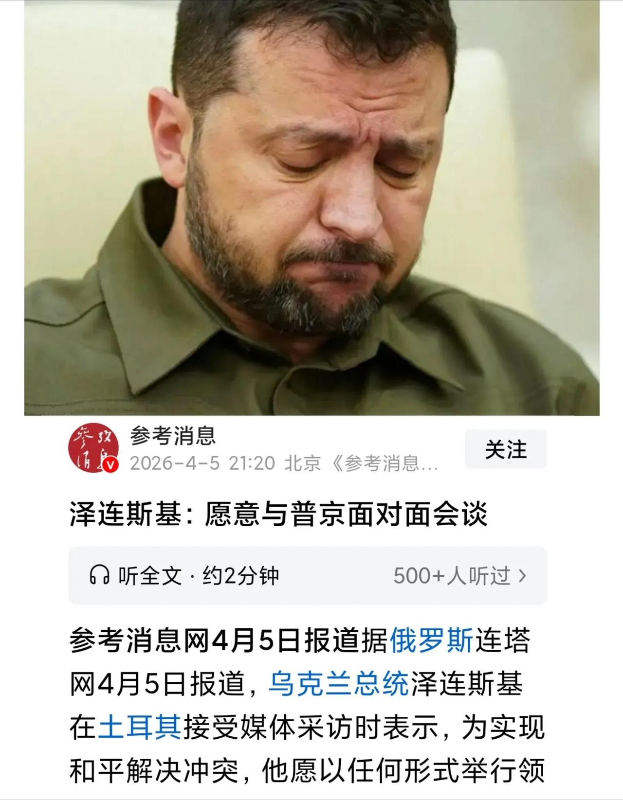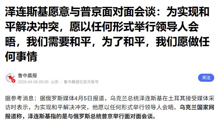 泽连斯基想谈了,打不动了! 近期乌克兰总统泽连斯基公开表达了愿与普京进行任何形式领导人会晤的想法,一改此前拒绝和谈的态度,而俄罗斯此时却对和谈表现出冷淡态度。 这一态度反转背后,是俄乌冲突局势的何种变化?美伊局势的升级,又是否成为压垮乌克兰和谈态度的关键稻草? 泽连斯基此次在土耳其接受采访时的表态,让外界看到了乌克兰在和谈态度上的明显转变。此前的俄乌冲突中,乌克兰一直对和谈持消极态度,一心寄望于北约等外部势力的支持,试图通过军事手段扭转战场局势,在谈判桌上掌握更多主动权,彼时的泽连斯基政府,始终将和谈的门槛定得较高,和谈之事也因此迟迟没有实质性进展。 而如今泽连斯基主动松口,愿意以任何形式举行领导人会晤,背后实则是现实局势的倒逼。战场之上的僵持,让乌克兰的军事力量持续消耗,长期的战事也让乌克兰的民生和经济承受着巨大压力,想要继续支撑战事,外部援助是关键。 但美伊战争的突然开打,让原本就分散的国际注意力再次被转移,乌克兰能获得的外部支持,也不可避免地出现了变数,泽连斯基政府显然也看清了这一现实,不得不放下此前的强硬,主动释放和谈信号。 回望历史,类似因外部支援生变而改变和谈态度的情况并不少见,上世纪的局部冲突中,不少原本寄望于外部援助的一方,在援助缩水或中断后,都会重新审视自身的局势,最终选择回到和谈桌前,泽连斯基的此次转向,不过是历史的又一次重演。 美伊局势的升级,成为了俄乌冲突背后的重要外部变量,也直接影响了乌克兰的决策。此前乌克兰之所以敢一直拒绝和谈,很大程度上是因为有以美国为首的西方国家的军事、经济等多方面援助,这些援助成为了乌克兰继续战事的重要底气。 而美伊战争开打后,美国等西方国家的精力和资源,必然会向中东地区倾斜,对乌克兰的援助力度,大概率会出现不同程度的缩减。 对于乌克兰而言,这无疑是釜底抽薪般的影响。失去了足够的外部支持,乌克兰想要在战场上继续和俄罗斯抗衡,难度会大幅增加。 泽连斯基政府显然也意识到了这一点,看不到持续战事的希望,自然也就放弃了此前寄望北约、四处寻求支援的想法,转而选择主动提出和谈,这也是其在现实面前的无奈选择。 那些此前既支持乌克兰又支持以色列的势力,如今也陷入了两难境地,中东和东欧的两场局势,让其难以兼顾,原本对乌克兰的支持力度必然会有所下降,这部分势力的态度转变,也让乌克兰的处境愈发尴尬,这也是泽连斯基不得不谈的重要原因。 面对泽连斯基的和谈信号,俄罗斯却表现出了不愿谈的态度,这一态度的反转,实则是战场局势和谈判筹码变化的结果。 此前乌克兰拒绝和谈时,俄罗斯始终保持着愿意通过和平方式解决冲突的态度,而如今乌克兰主动松口,俄罗斯却选择按兵不动,核心原因在于,如今的战场局势,让俄罗斯掌握了更多的谈判主动权,所谓的“打服”,正是俄罗斯不愿轻易谈和的底气。 长期的战事中,俄罗斯凭借着稳定的军事力量和后勤保障,逐渐掌握了战场的主导权,乌克兰的军事防线不断收缩,战力也持续消耗。 此时泽连斯基提出和谈,更多的是迫于现实的无奈之举,而非真心实意地想要解决冲突。对于俄罗斯而言,此时的和谈,若没有符合自身核心利益的条件,贸然开启反而可能让此前的战场成果打折扣,因此选择暂时拒绝和谈,也是情理之中的决策。 在国际冲突的谈判中,从来都是实力决定话语权,俄罗斯如今的态度,正是其战场实力的直接体现,只有让乌克兰真正认识到自身的处境,让和谈的条件符合双方的核心利益,和平谈判才有可能拥有实质性的进展。 泽连斯基的和谈转向,是俄乌冲突局势发展的必然结果,也是外部局势变化带来的连锁反应。这场冲突的和平解决,从来都不是一方的意愿就能决定的,需要双方的共同努力,也需要考虑复杂的外部因素。 未来俄乌冲突的走向,仍取决于战场局势和双方的谈判筹码,而国际局势的变化,也会继续成为重要的影响变量,和平的窗口虽已出现,但想要真正推开,依旧任重道远。