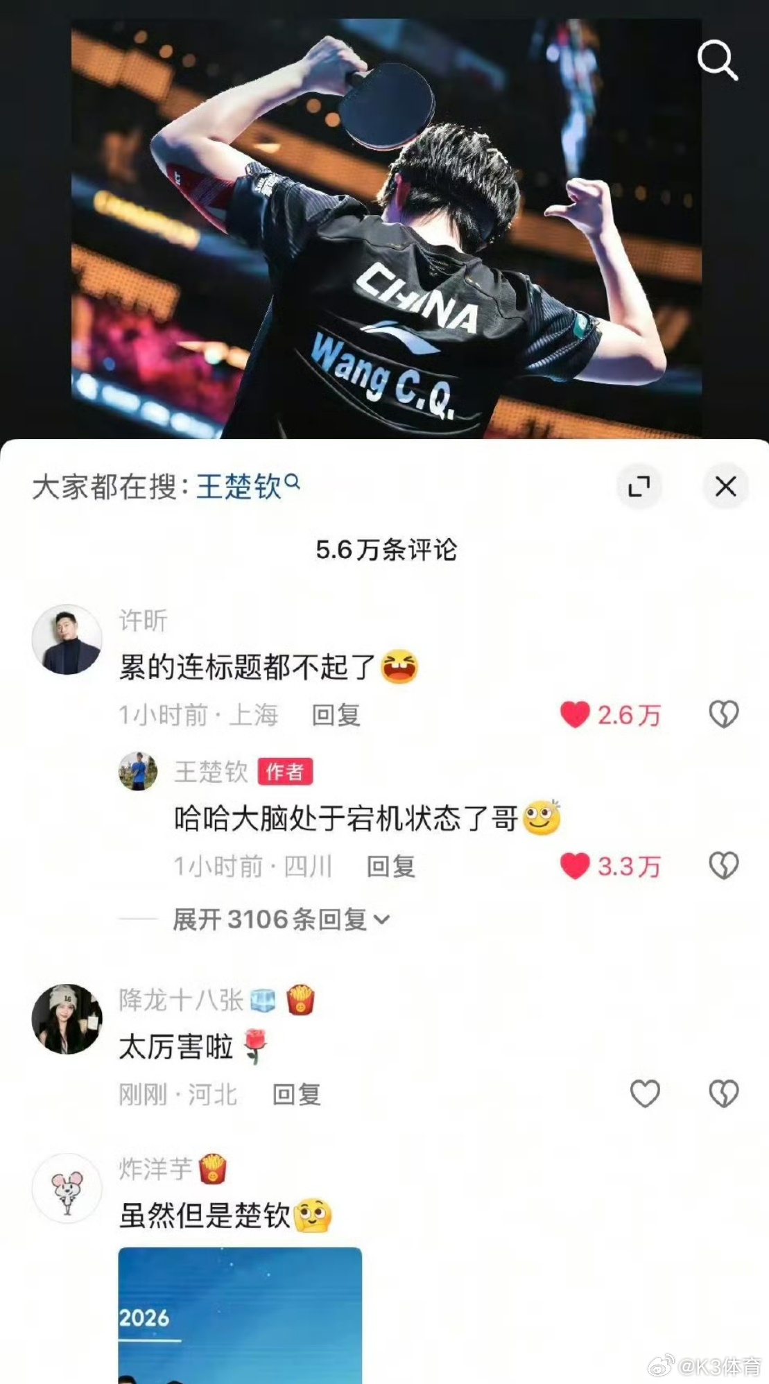 王楚钦回复许昕大脑处于宕机状态了王楚钦澳门世界杯夺冠后累到连社媒标题都没配,被前