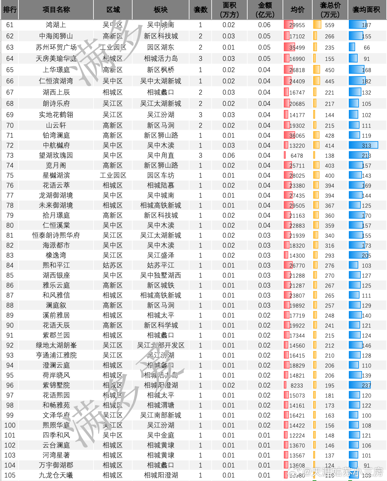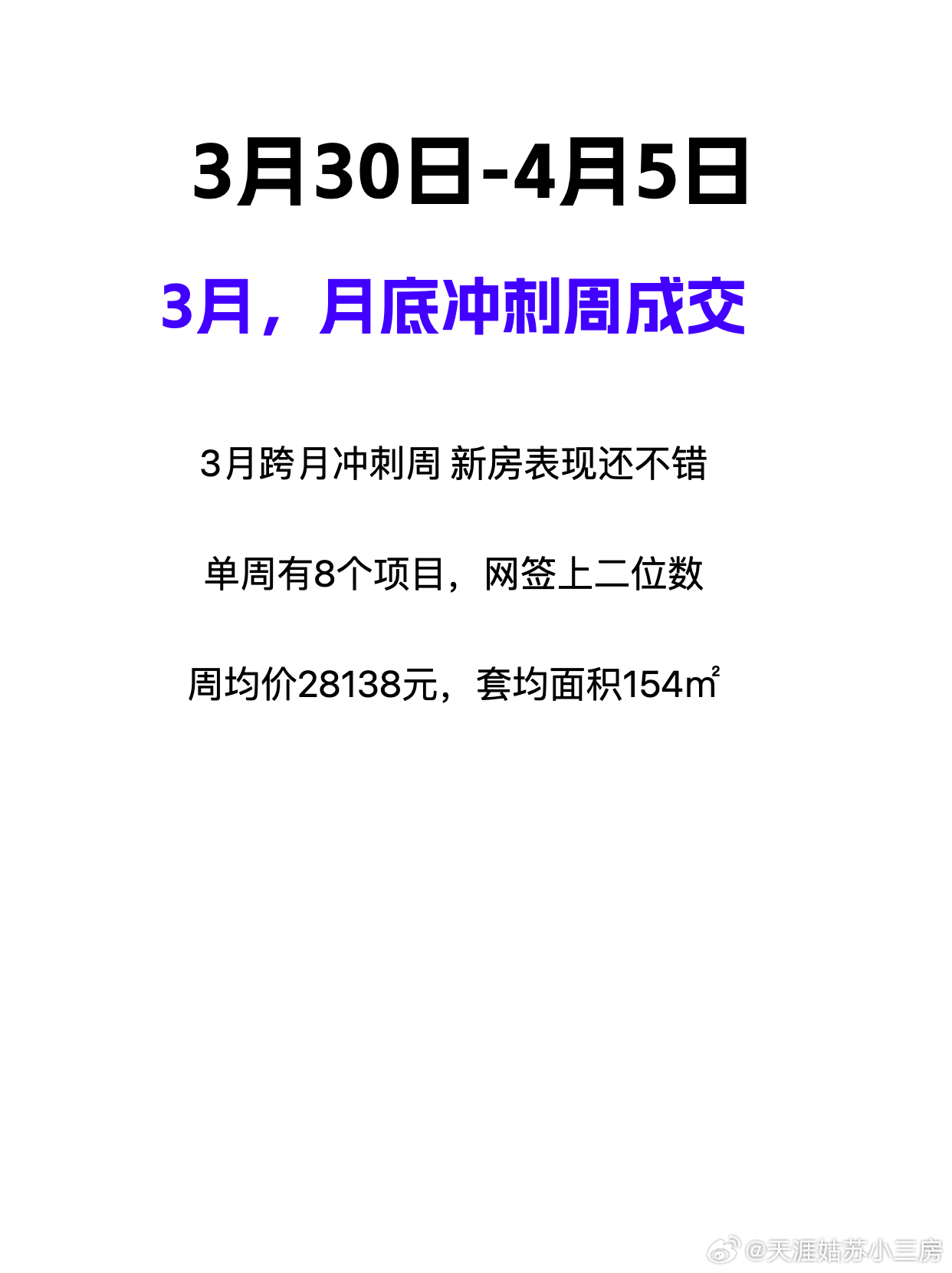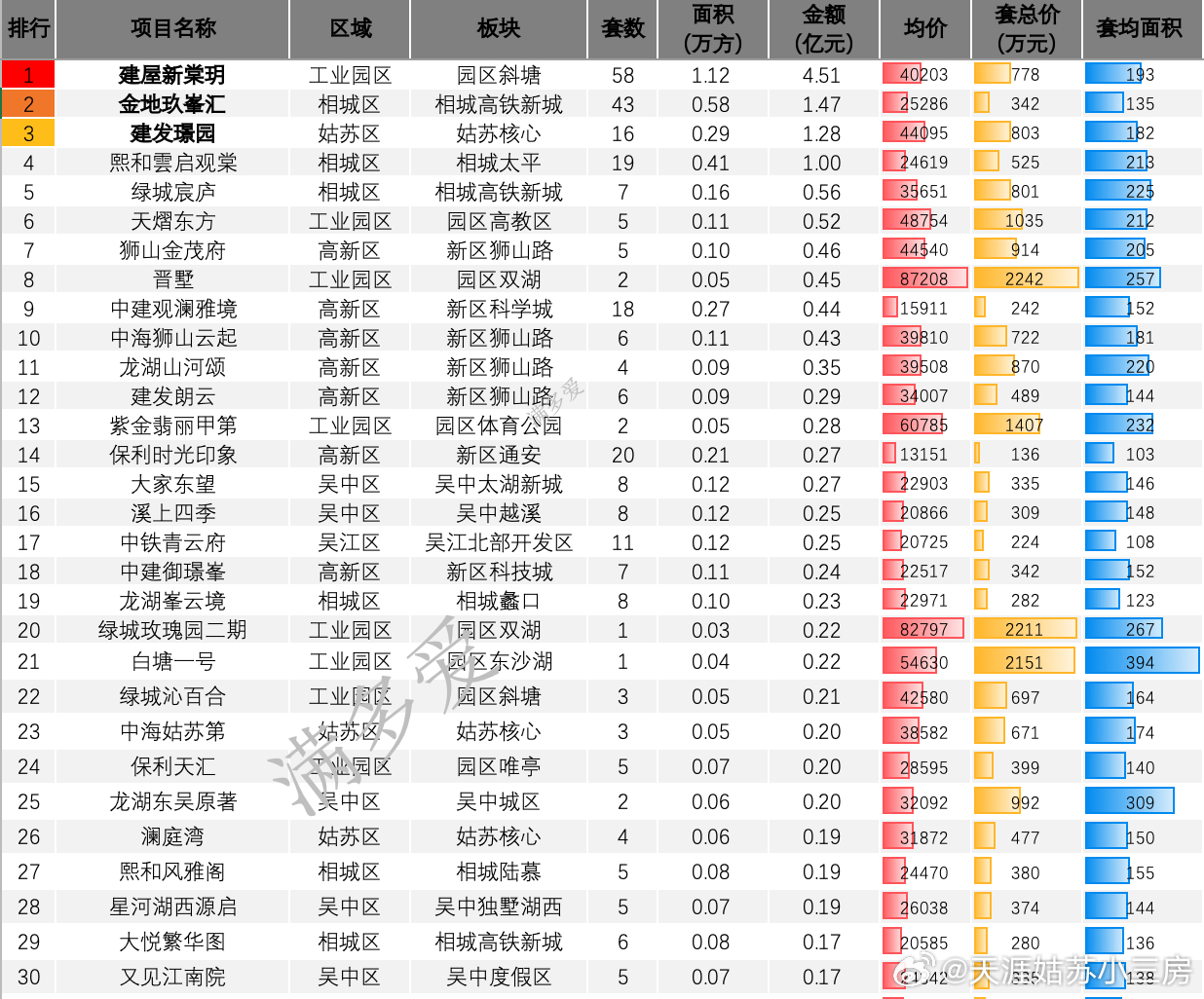3月最后一周结束了 看看新房成交吧本周属于月底冲刺,也是一季度收官。因此部分项目有工抵但是总体而言,月底各个项目逼签还是比较踊跃刚需盘月度成绩还是不错的。如通安的保利时光印象,20套吴江与吴中交界的中铁青云府11套,吴中度假区北辰观澜府12套改善类项目,顺销量本周超过过去平均单周成绩新开盘新加推项目,表现符合预期如熙和雲启观棠19套,建发璟园16套,星河湖西源启5套