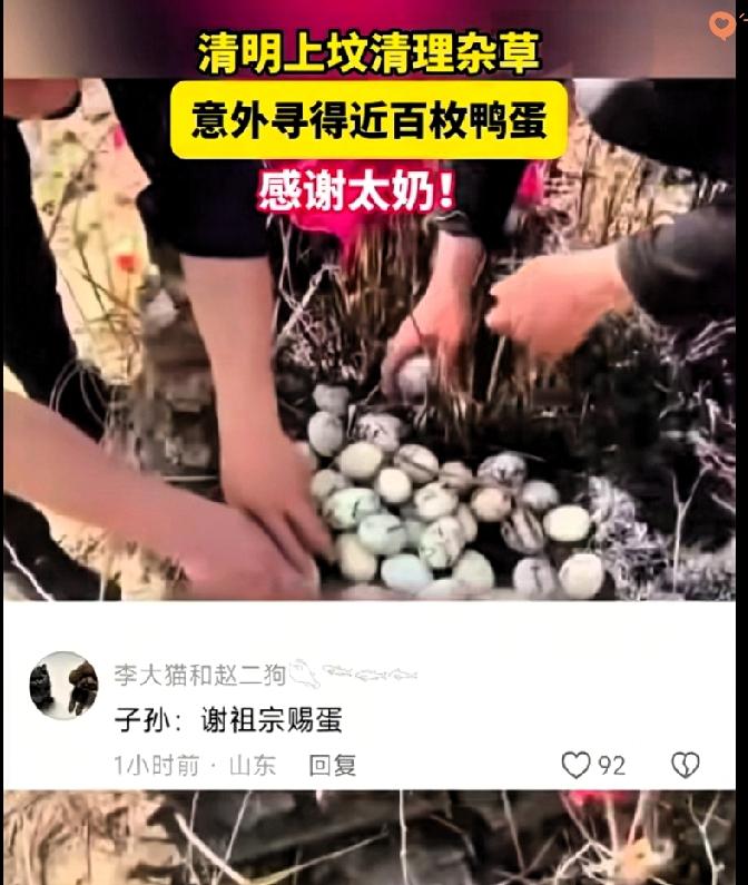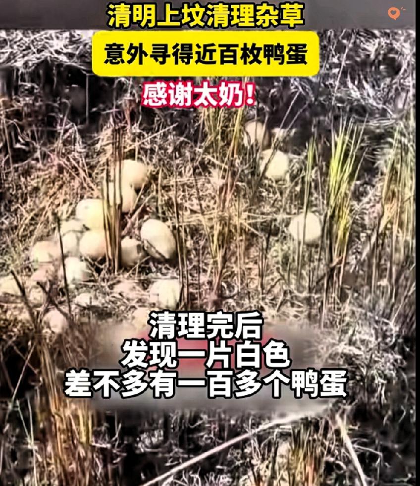 清明扫墓还能捡“天降福利”? 江西这家人的经历也太让人羡慕了! 江西九江冷先生一家清明祭扫,清理祖坟杂草时,竟在旁边翻出近百枚鸭蛋,一家人又惊又喜,当场笑称是太奶心疼后辈送来的福气。 同行9人刚好每人分到10个,不多不少刚刚好,这份巧合实在太妙。 比起单纯的意外收获,我更觉得这是生活藏在传统节日里的温柔。 清明本是追思先人、阖家团聚的日子,这份突如其来的小惊喜,冲淡了思念的伤感,让祭祖多了几分烟火气与团圆乐。 与其说是灵异馈赠,不如说是自然与亲情撞了个满怀,平凡日子里的小确幸,往往最动人。 你们扫墓时遇到过什么有趣的小意外吗?