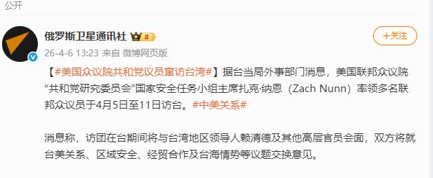 台“外交部”正式宣布, 4月6日,国民党主席郑丽文访问中国大陆前夕,台湾地区所谓“外交部”正式宣布:美国联邦众议院“共和党研究委员会”国家安全任务小组主席纳恩,带着一帮共和党籍的议员,在4月5号到11号窜访台湾,期间还要跟赖清德见面,并就区域安全、台海形势等议题交换意见。 郑丽文此次大陆之行,是两岸之间一次重要的政党交流,筹备已久,也承载着两岸民众希望缓和关系、加强沟通的期盼。行程会途经江苏、上海、北京等多地,核心目的是推动两岸在经贸、文化、民生等领域的务实合作,让两岸关系能朝着缓和、稳定的方向发展。 而台当局偏偏在这个关键节点炒作美国议员到访的事,本质上就是想给两岸正常的政治交流添堵,用外部干预来冲淡这次访问的积极意义。 美国国会的这些议员执意窜访台湾,本身就是对中国内政的粗暴干涉,也彻底违背了一个中国原则和中美之间达成的三个联合公报内容。台湾是中国领土不可分割的一部分,这是国际社会公认的事实,美国政客的这类举动,不仅在不断破坏中美关系的政治基础,也在持续搅动台海本就脆弱的和平局势,给区域安全埋下了更多不稳定的隐患。 这些美国共和党籍的政客,明明清楚台湾问题是中国的核心利益,却依旧不管不顾地踏上台湾的土地,说到底还是出于自身的政治私利。他们把台海问题当成捞取政治资本的工具,迎合美国国内的反华舆论,根本不会考虑这种行为会给台海民众带来怎样的安全风险,也不会顾及中美两国关系的整体发展。 台当局对于美方的这次窜访,不仅没有拒绝,反而大张旗鼓地对外宣传,背后藏着的就是 “倚美谋独” 的小心思。 民进党当局执政多年,始终不肯承认体现一个中国原则的 “九二共识”,一门心思靠着外部反华势力撑腰,不断在岛内推动 “去中国化” 的操作,炒作两岸对立。这种做法完全违背了两岸同胞的共同心愿,也让台海局势一步步走向紧张。 赖清德作为 “台独” 分裂势力的代表人物,主动与美国窜访议员会面,大谈区域安全与台海形势,无非是想借着美国的声势,强化自己的分裂立场。他的一系列言行,始终在挑战两岸关系的底线,把台湾推向危险的边缘,最终受损的只会是广大台湾民众的切身利益。 反观两岸民间的交流,这些年一直保持着升温的态势。台湾的农渔产品源源不断销往大陆,两岸青年在求学、就业、创业上的互动越来越密切,文旅往来也在逐步恢复,两岸融合发展的趋势已经成为不可阻挡的潮流。郑丽文的大陆之行,正是顺应了这股民意,希望为两岸沟通搭建桥梁,而台当局此时的操弄,完全是在逆着民意行事。 世界上只有一个中国,台湾作为中国的一部分,有着清晰的历史和法理依据,这是任何势力都无法篡改的事实。从国际公约到全球多数国家的外交立场,一个中国原则都是国际关系中不可动摇的准则。 美国政客的窜访、台当局的迎合,都改变不了台湾的法律地位,更阻挡不了中国维护国家主权和领土完整的决心。 大陆始终以两岸同胞的福祉为出发点,不断出台惠台利民的政策,为台湾民众在大陆发展提供便利,坚持用和平方式推动两岸关系发展。 但这并不意味着我们会容忍外部势力干涉和 “台独” 分裂活动,对于任何企图分裂国家的行为,大陆都会采取一切必要措施予以反制,守护国家的核心利益。 台当局以为靠着美国政客的几次窜访,就能实现自己的分裂图谋,这完全是不切实际的幻想。历史的潮流始终向着国家统一、民族复兴的方向前进,两岸同胞同根同源、血脉相连,实现祖国完全统一是全体中华儿女的共同心愿。 无论是美国的反华政客,还是岛内的 “台独” 势力,都无法逆转两岸统一的大势。他们的种种操弄,最终只会遭到两岸民众的共同反对,也必然会在历史的潮流中以失败收场。台海的和平稳定,从来不是靠外部势力撑腰就能实现的,只有回到一个中国原则的基础上,推动两岸对话协商,才能真正守护好两岸同胞的共同家园。