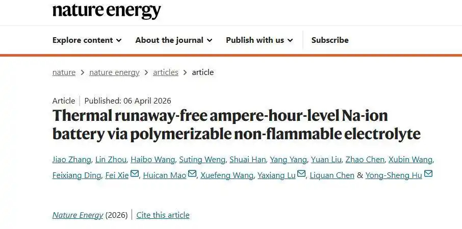 据科技日报等多家媒体报道,4月6日,中国科学院物理研究所胡勇胜团队在《自然·能源》发表重磅成果,该团队成功开发出一种具有自保护功能的可聚合不燃电解质(PNE),全球首次在安时级钠离子电池中实现彻底阻断热失控。该研究成果打破了“阻燃电解液等于安全”的传统认知,跳出单一防线,构建了“热稳定性-界面稳定性-物理隔离”三位一体的智能安全防护体系。据悉,当电池温度异常升高至150°C以上时,PNE会自动由液态固化为致密屏障,犹如在电池内部筑起一道“智能防火墙”,彻底切断热失控的传播路径。为钠离子电池在电动汽车、重型卡车、大规模储能等领域的商业化落地奠定了坚实基础。