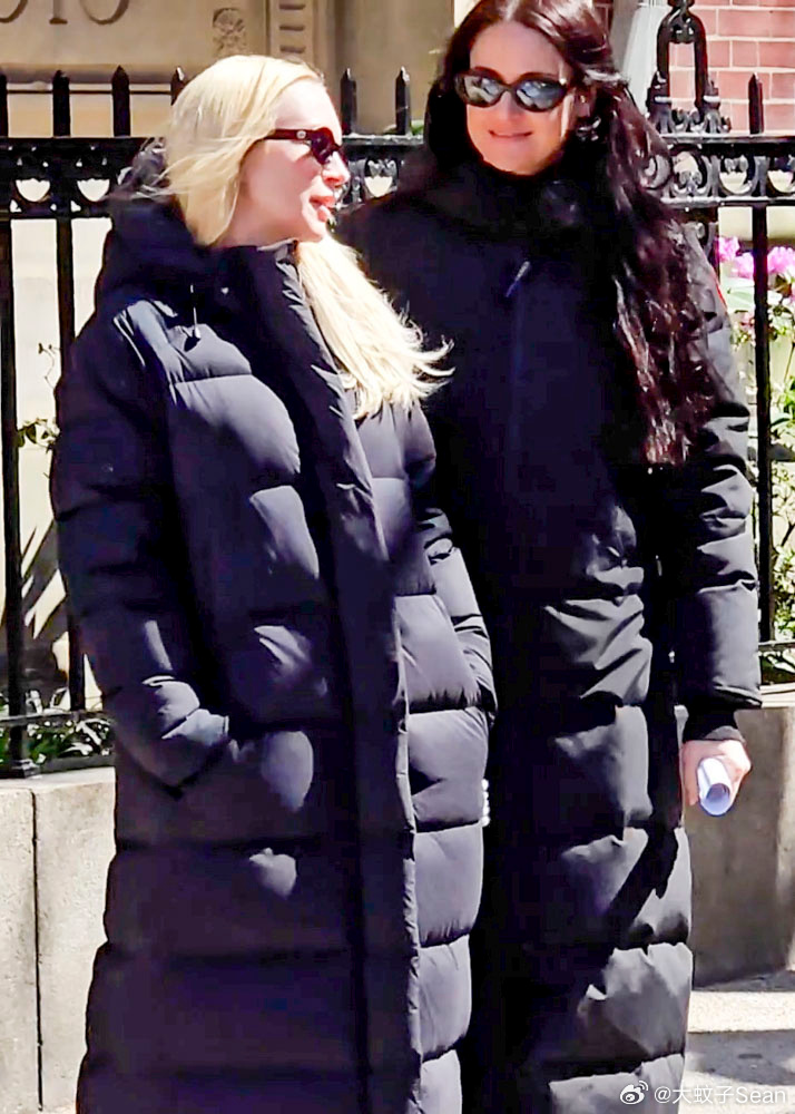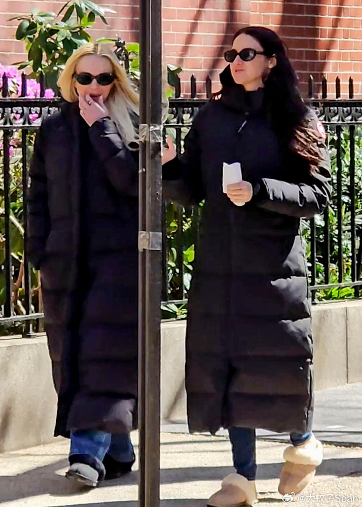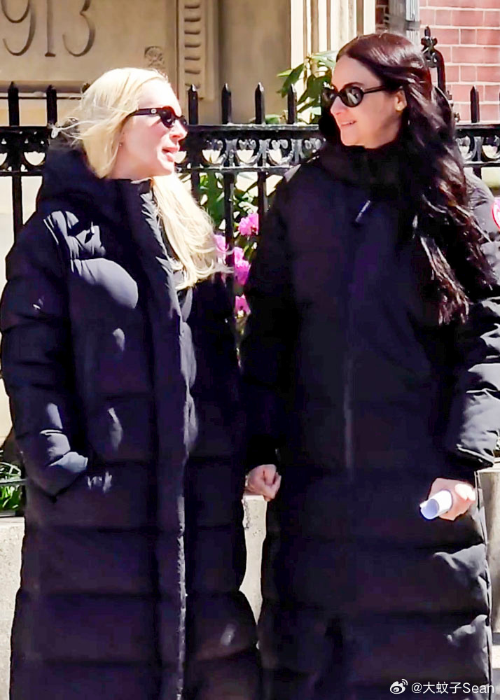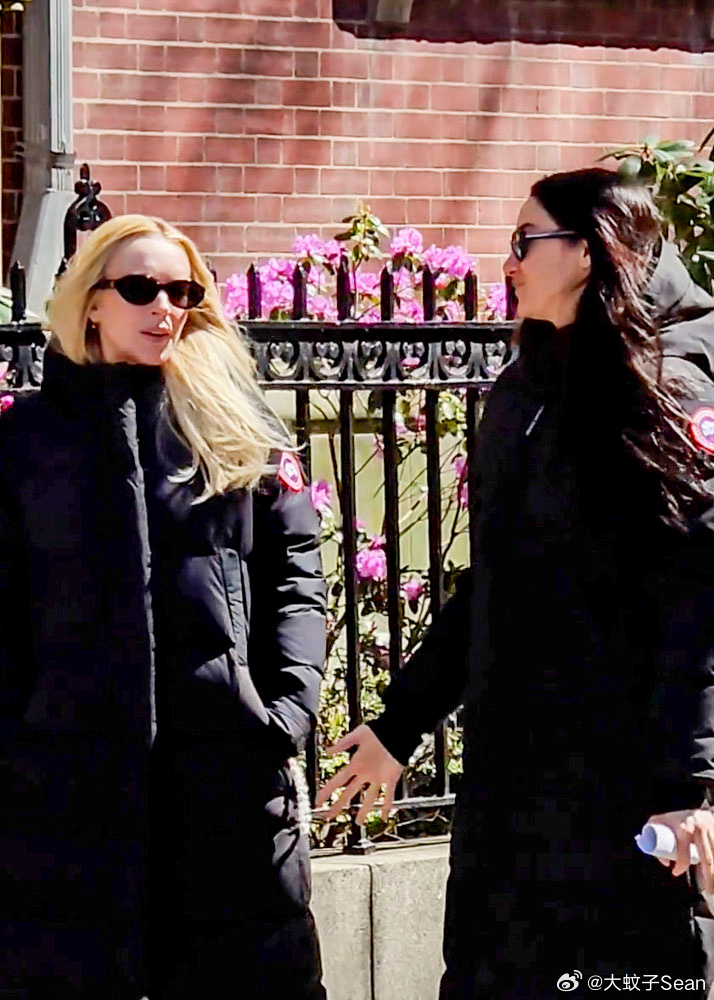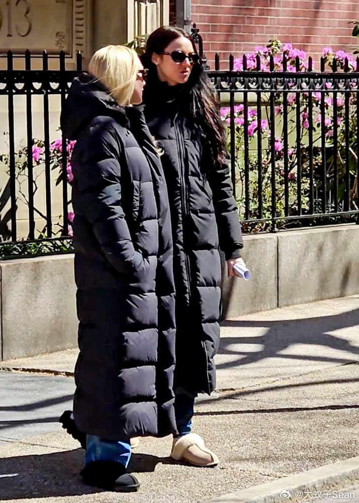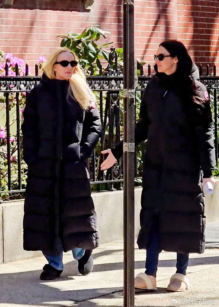 Lindsay Lohan林赛罗韩和Shailene Woodley继续在纽约为新剧《count my lies》进行拍摄,两人歇戏时穿着厚羽绒在片场闲聊