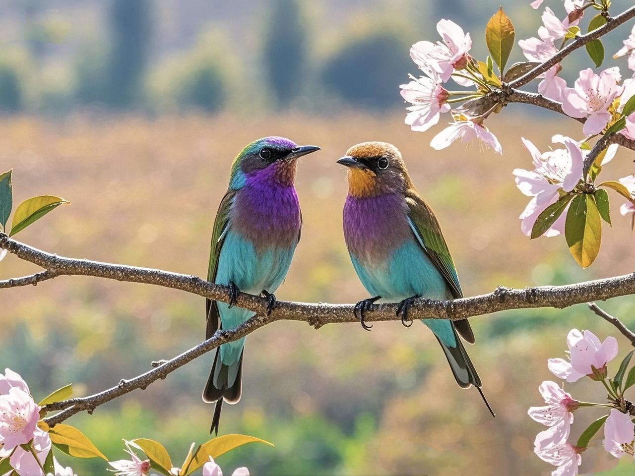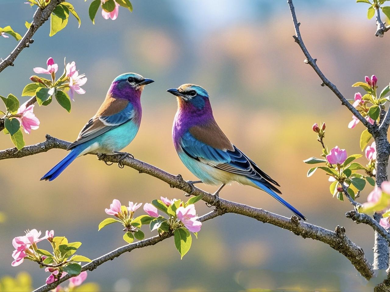 我的今日状态:😁轻松愉快 我这里的天气:🌤️多云 《春枝双禽》 晴光漫染碧枝柔,粉萼轻舒缀翠流 一羽虹裁云作色,双禽语软风为酬 左禽凝睇含清韵,紫焰披肩映碧眸 蓝尾拖春裁晓露,金冠缀日暖芳畴 右禽侧首含娇态,橙绒覆颈漾温柔 青翼舒风裁柳色,翠翎曳影动芳洲 盘花缀蕊香盈袖,嫩叶青芽润玉喉 立尽晴川千叠翠,衔来春色一梢头 烟光漫笼林梢暖,花影轻摇岁月悠 不羡云天千万里,只贪枝上两情稠 人间最是春无价,一帧清景入诗眸 双禽共守芳菲境,岁岁春风共白头