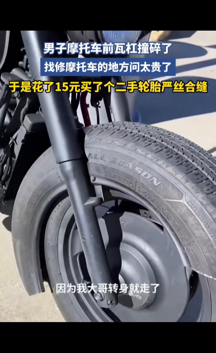 男子摩托车前瓦杠撞碎了,找修摩托车的地方问太贵了,于是花了15元买了个二手轮胎严