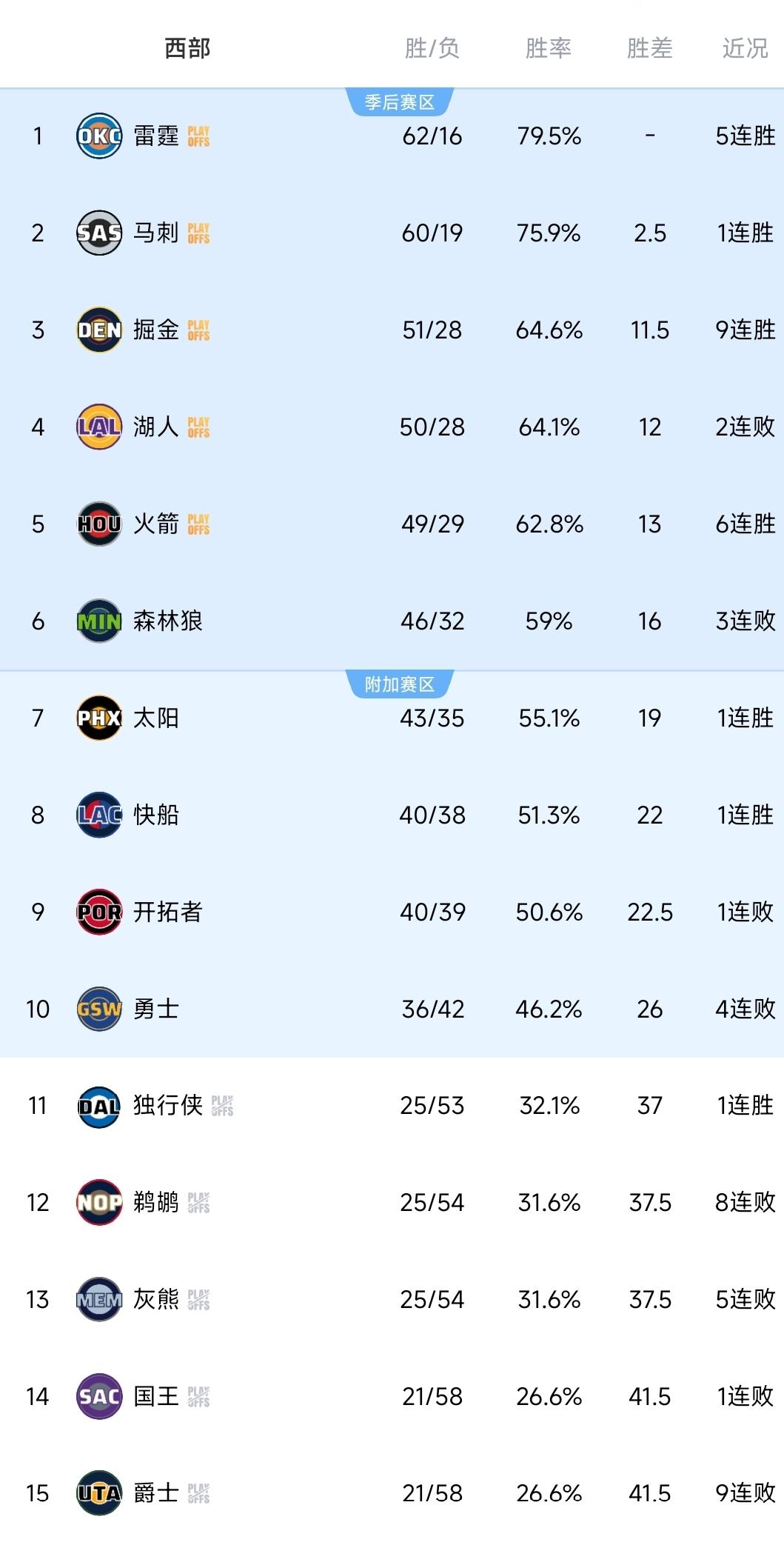 西部排名又乱了! 掘金逆转开拓者,反超湖人,升至西部第三! 快船收大礼,守住第八! 北京时间4月7日,NBA常规赛临近尾声,本比赛日四支西部队伍相继出战。 ①灰熊126-142骑士。 骑士对于东部第四的位置比较满意,没有战绩压力,于是队伍作出轮休,哈登和米切尔双双缺席,比赛前程不太顺利,经过一段时间的适应,状态回暖,逐渐扭转颓势走上正轨。残阵灰熊进攻表现不错,全队投进29记三分追平NBA历史纪录,且命中率接近五成,只是防守端没能限制,最终还是吞下失利。 ②马刺115-102战胜76人。 经过首节的激烈缠斗,比赛主动权慢慢被马刺掌控,虽说仅是微弱领先,但他们总能及时作出回应,上半场文班亚马意外对抗伤退,如此突发状况没有影响队伍节奏,卡斯尔站出来串联组织,哈珀和约翰逊领衔的替补席也支棱起来,于是下半场顶住76人三巨头的猛烈反扑,顺利告捷,迎来本赛季的第六十胜。 ③掘金137-132开拓者。 开拓者状态极佳,上半场以超过五成命中率飙进16记三分,这让他们是手握两位数的优势。掘金很长一段时间都较为被动,直到第四节才迎来强力反弹,多点发挥抹平差距,尽管被拖入加时,但他们明显更有经验,最终成功逆转,约基奇35分+14板13助攻的三双数据。