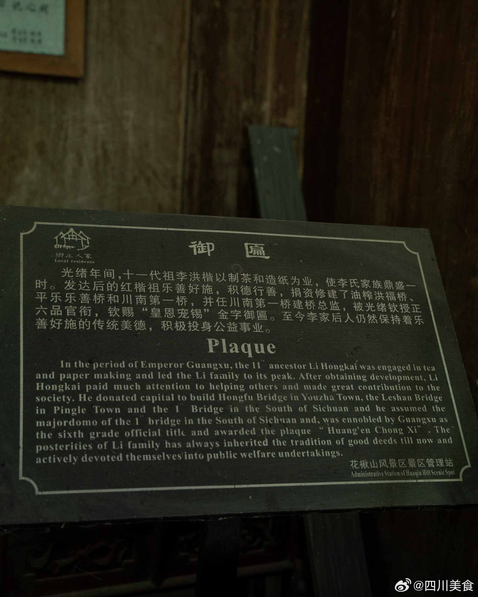 我们把这种清明之前采摘的老川茶树手工搓出来的茶,叫手工甘露。邛崃花楸山李家大院,他家祖上就是世代采摘贡茶,康熙御封“天下第一圃”就在这儿,此后花楸贡茶年年上贡,闻名天下。光绪御赐“皇恩宠赐”额匾,至今还在李家大院堂屋挂到的。