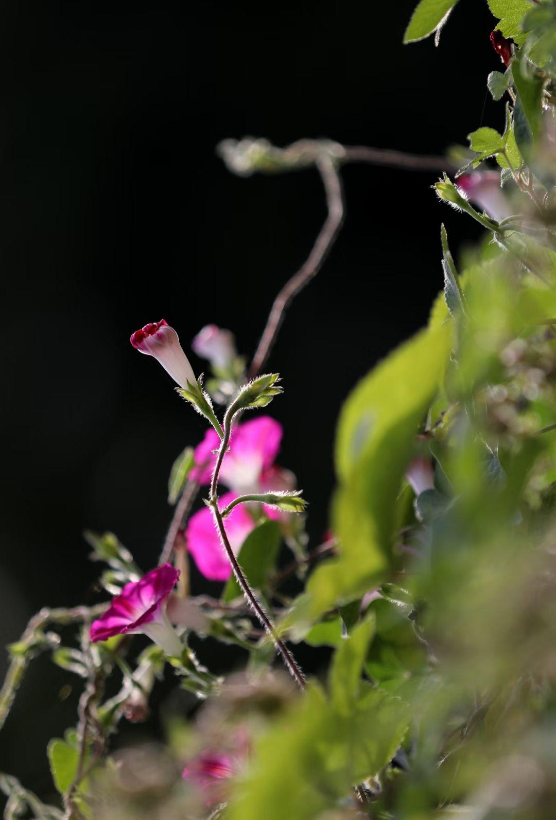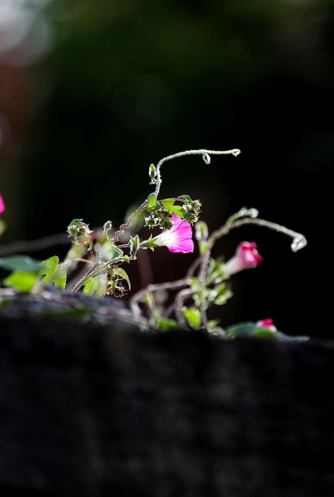 小区内的假山喷池里,石头长期被水淋长满了苔藓,显得古老久远,随意长出来的几株大概叫牵牛花的植物,水灵秀气,加上逆光而洒下来的阳光,线条清晰,姿态柔美妩媚,虽然只有几株且不大,但张力极强,热情奔放,利用深色的背景,大光圈记录了下来,明暗对比,是我自己比较喜欢的一组随手拍。