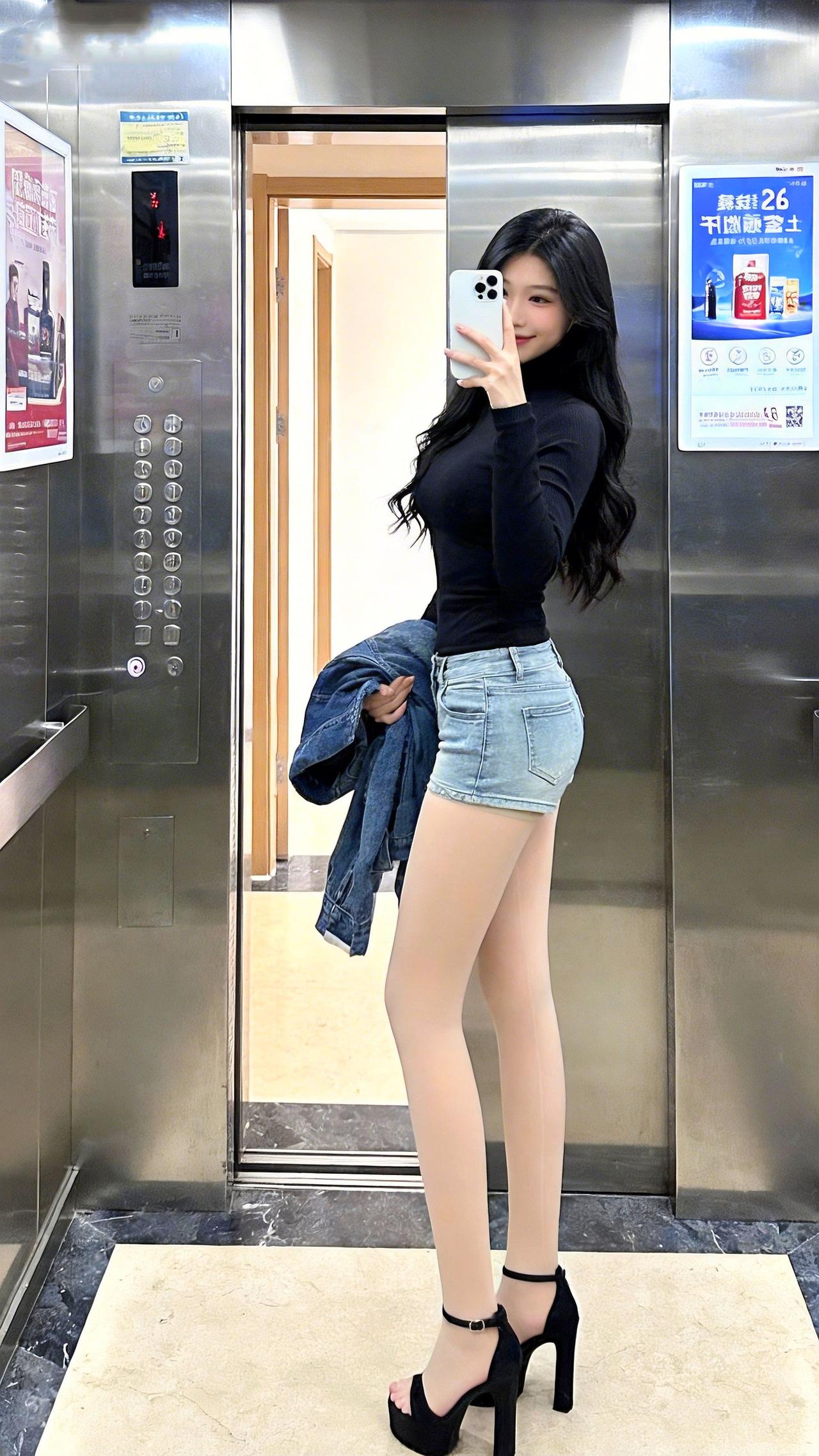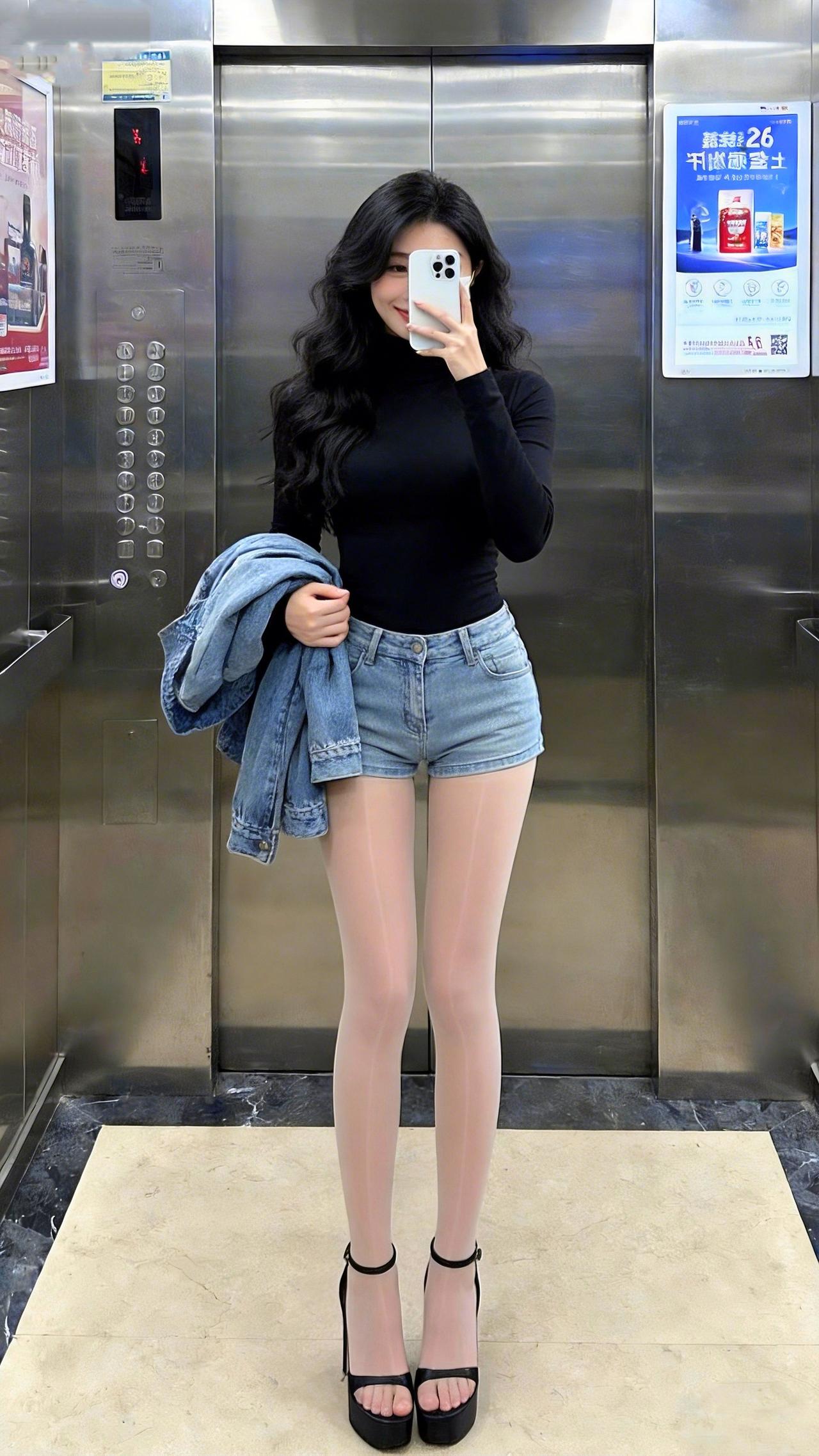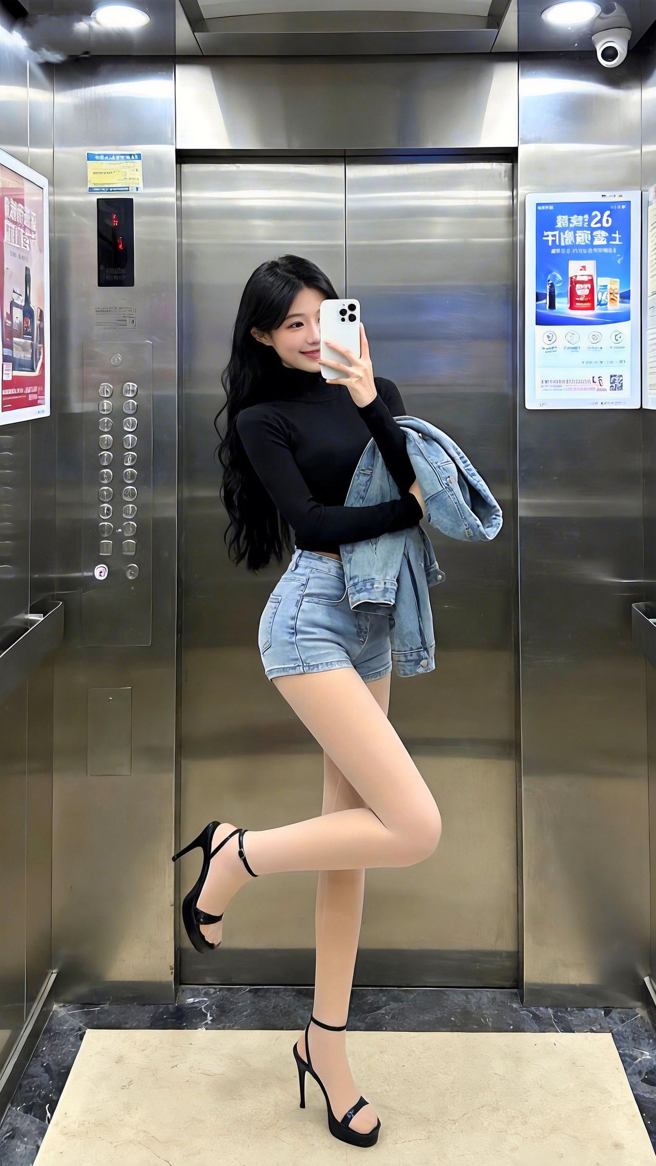 电梯间里,黑紧身衣裹着利落的辣,牛仔短裤一搭又添了松弛的酷~凉鞋踩出轻熟感,这种