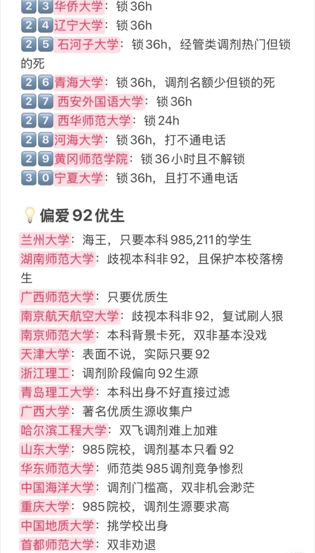 ❶ 查院校锁时习惯去目标院校研究生院官网,找往年的调剂公告,看看它往年的锁定时间是多久——有的院校比较良心,锁定12-24小时,效率很高,不耽误你填其他志愿;有的院校就比较鸡贼,直接拉满36小时,主打一个占着茅坑不拉屎,就是想等更优质的调剂生源,把你当备胎。