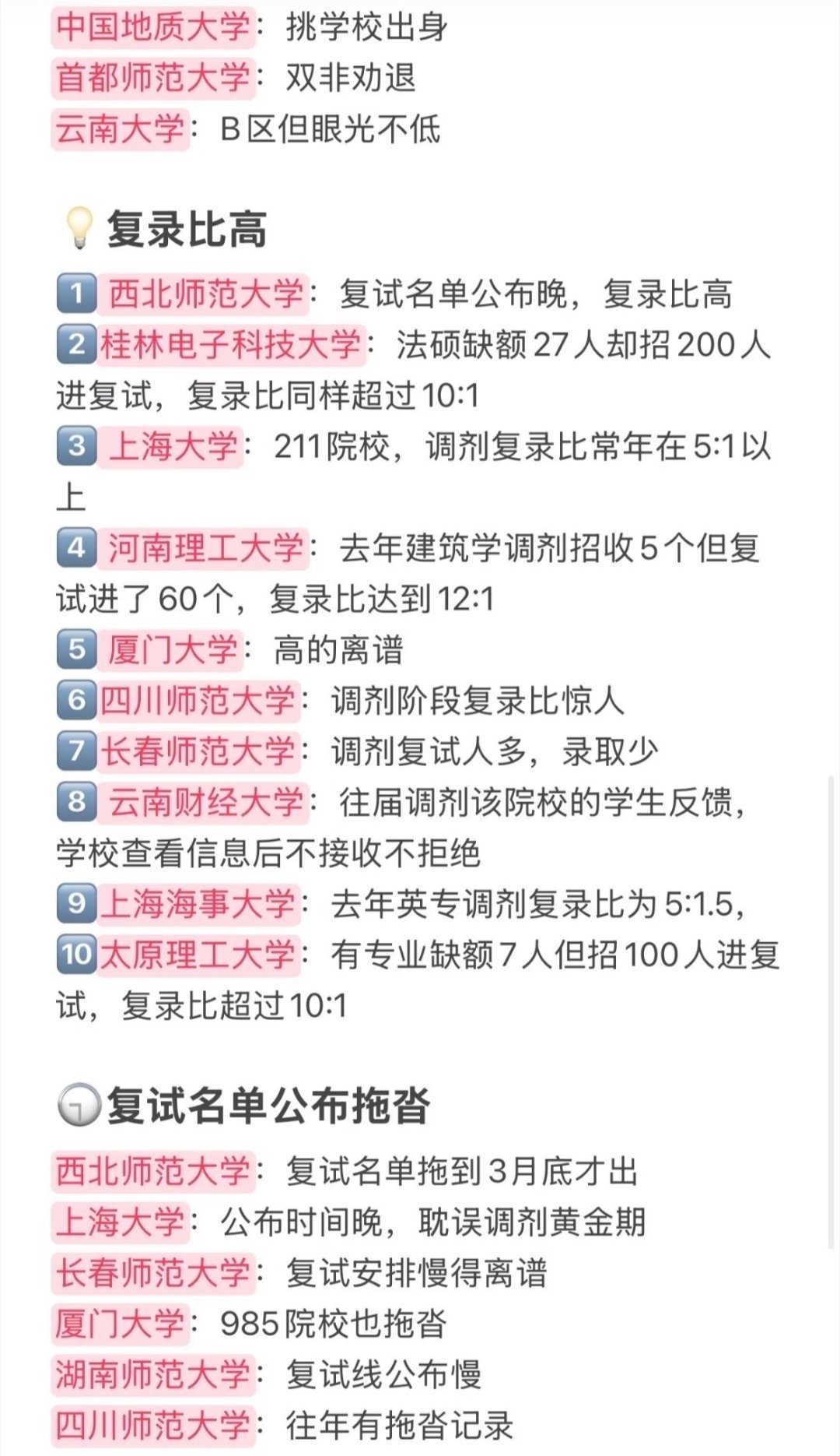 ❷ 不死等,提前留好后手锁定期间,别闲着,继续搜集其他院校的缺额信息,整理好备用志愿。一旦发现当前锁定的院校大概率不会给复试通知,或者有更好的院校放出名额,就做好解锁后立刻补填的准备,别等解锁后手忙脚乱,错过最佳时机。