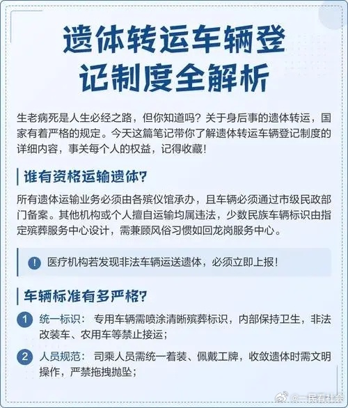 遗体接运车应当符合相关强制性标准,禁止制造、销售、使用不符合强制性标准的遗体接运车 。也就是说,不能用 破车、改装车来运遗体。
