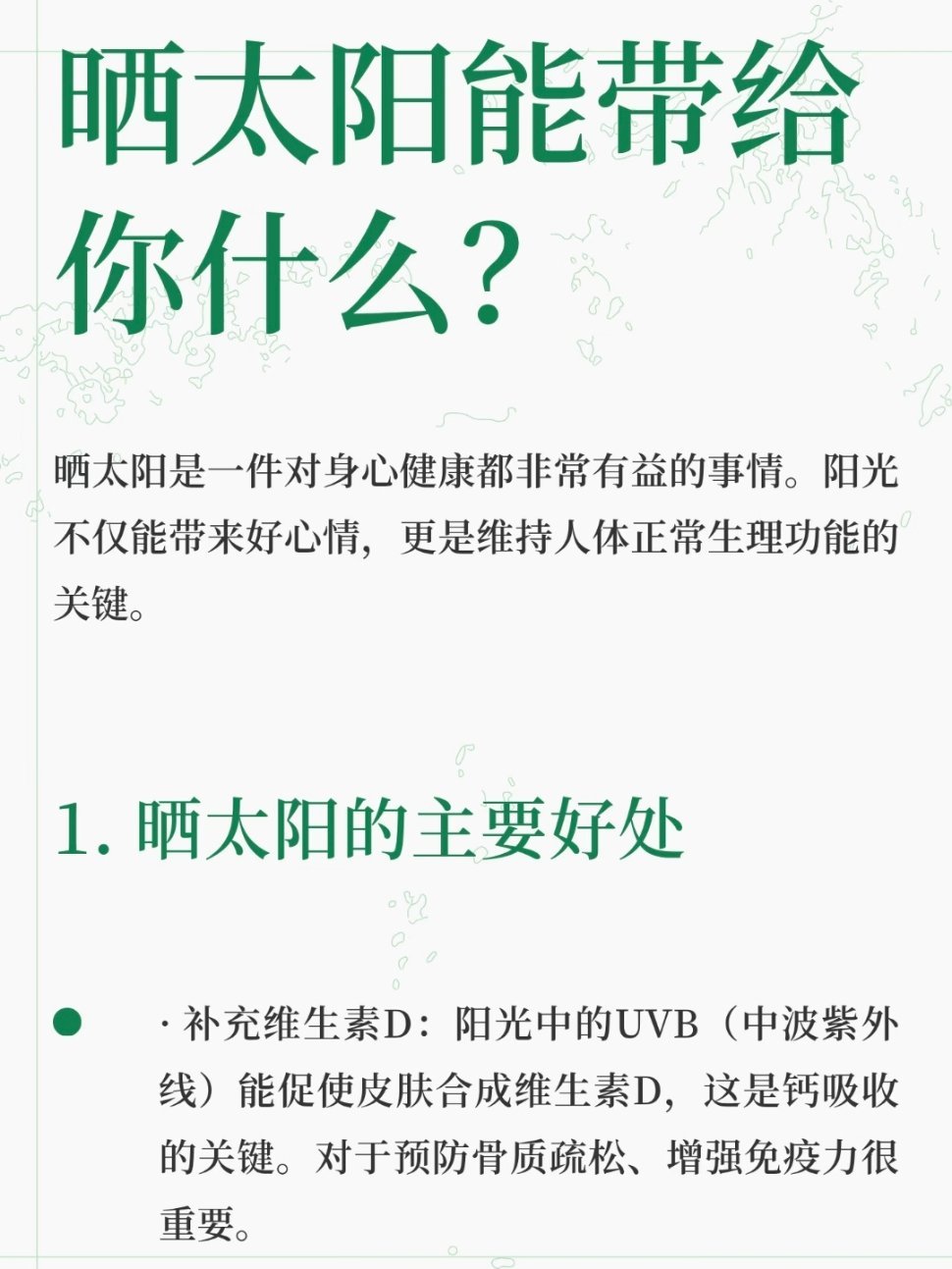 晒太阳时,身体会经历一系列变化,既有益处也有 风险。适度晒太阳能促进维生素D合成,有益骨骼 健康和情绪调节;但过度暴晒则会引发日晒伤、加 速皮肤老化,甚至增加皮肤癌风险。关键在于把捕 好“度”,科学地享受阳光。