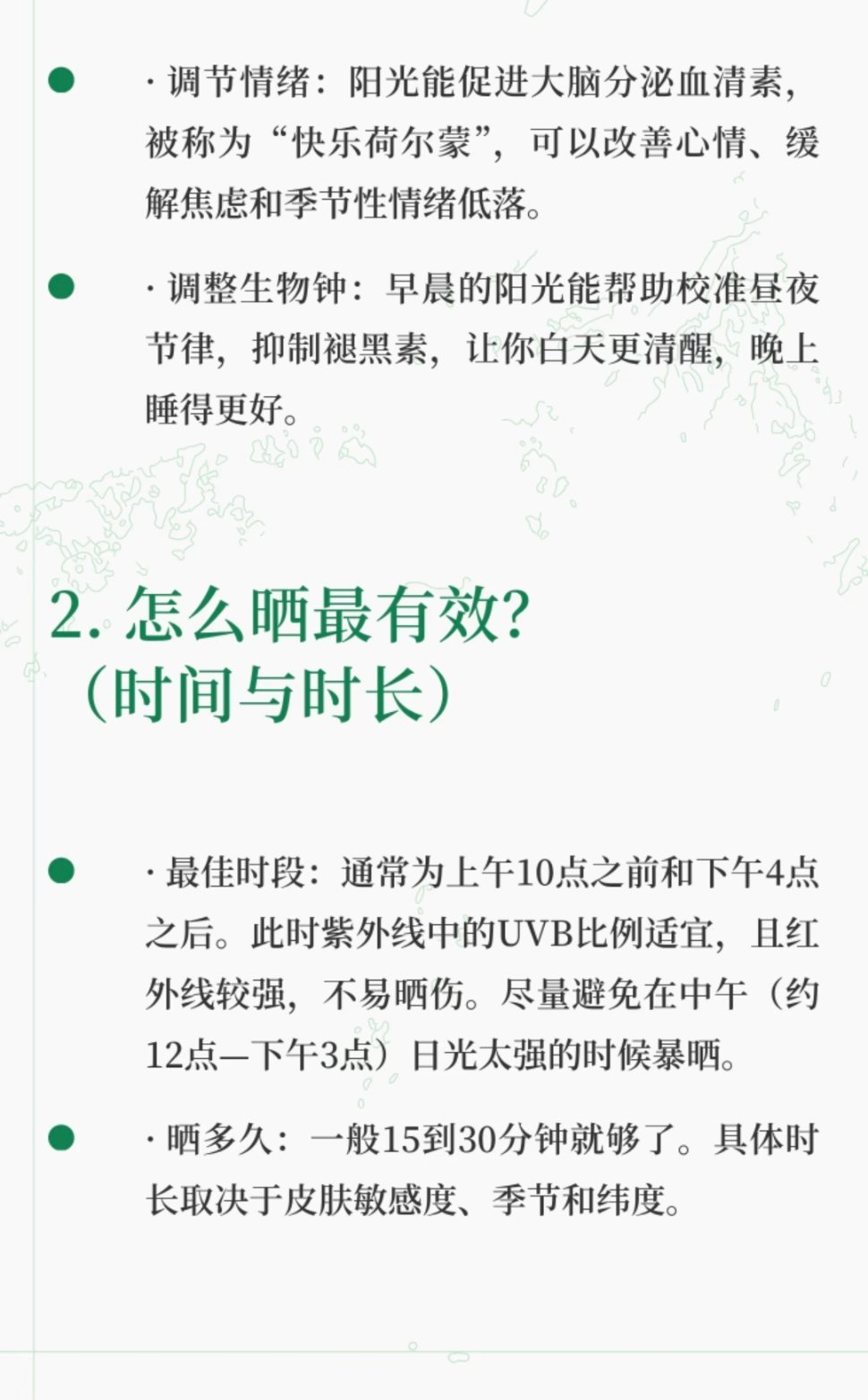 如何科学地晒太阳? 享受阳光的好处,同时规避风险,关键在于科学防 护。 把握时间:建议在上午10点前或下午3点后,紫 外线相对较弱时晒太阳。 每周2-3次,每次5-30 分钟即可满足大部分人的维生素D需求。 做好防护:在紫外线强的时段或进行户外活动 时,务必采取防护措施。 物理遮挡:戴帽子、太阳镜、穿防晒衣,使用 遮阳伞。 涂抹防晒霜:选择SPF30+、PA+++以上的防晒 产品,出门前20分钟涂抹,并每2-4小时补涂一次。 特殊人群注意:儿童、浅肤色人群、长期待在室 内的人以及服用光敏性药物或食用光敏性食物 (如某些蔬菜、海鲜)后,皮肤对紫外线更敏 感,需加强防护。