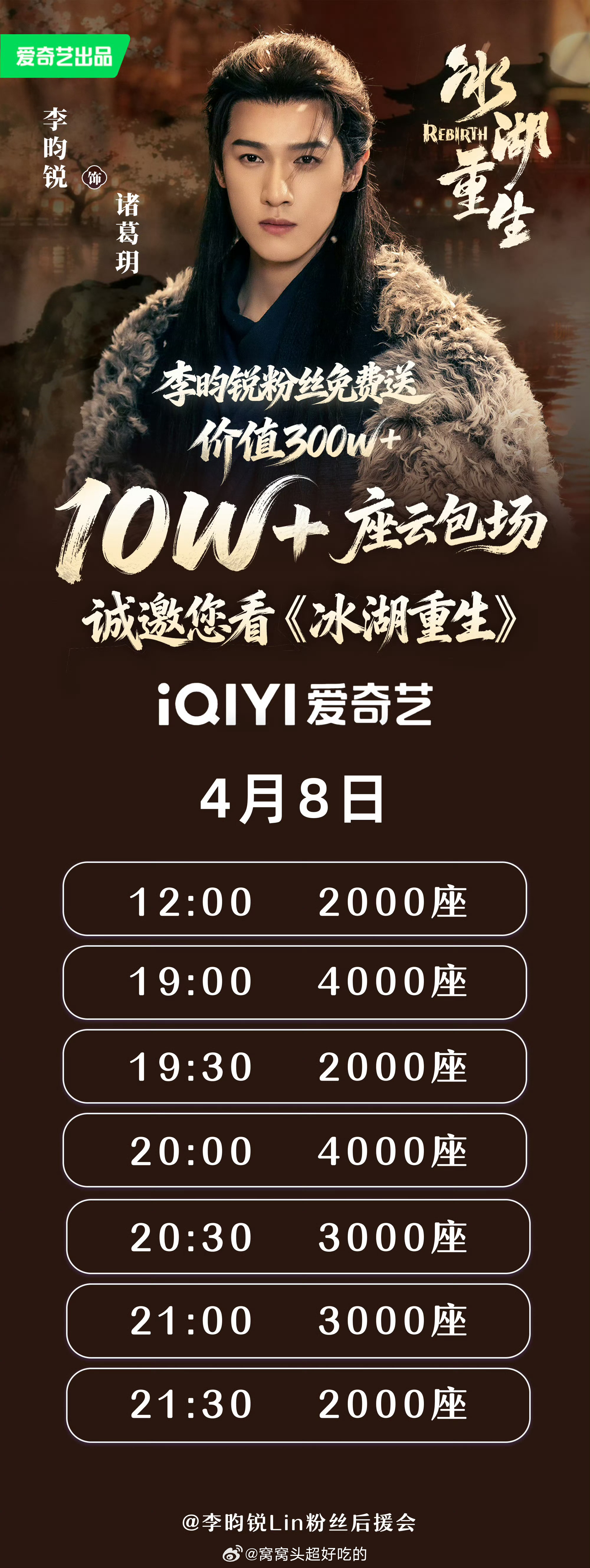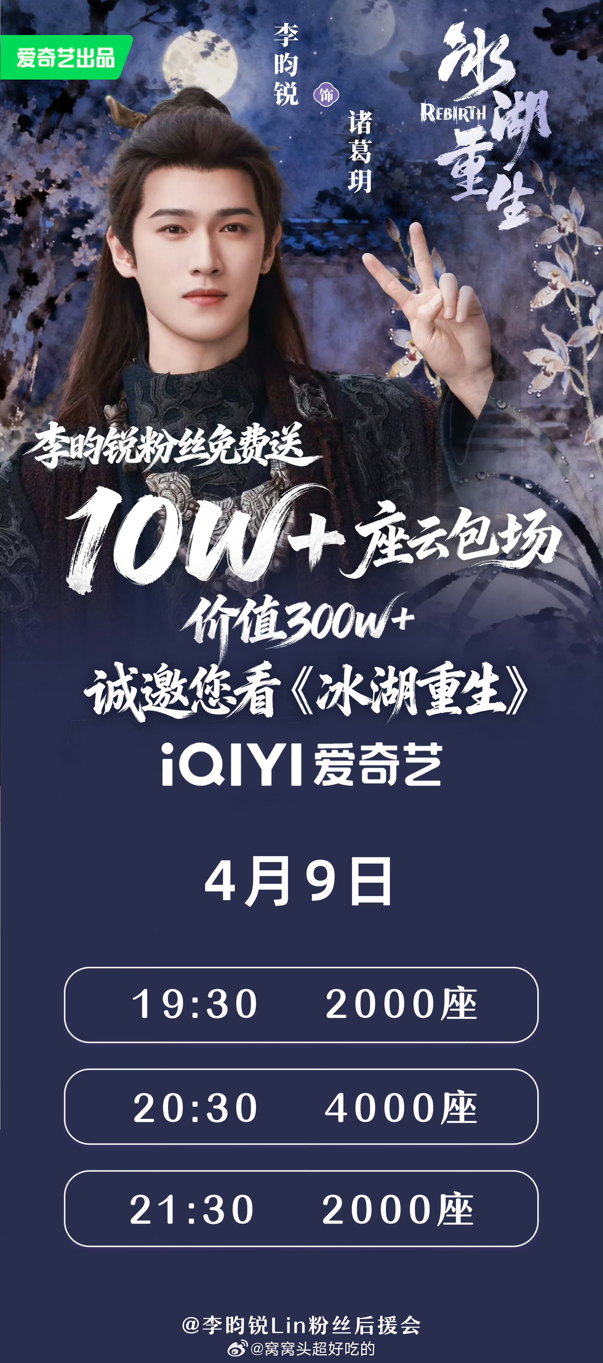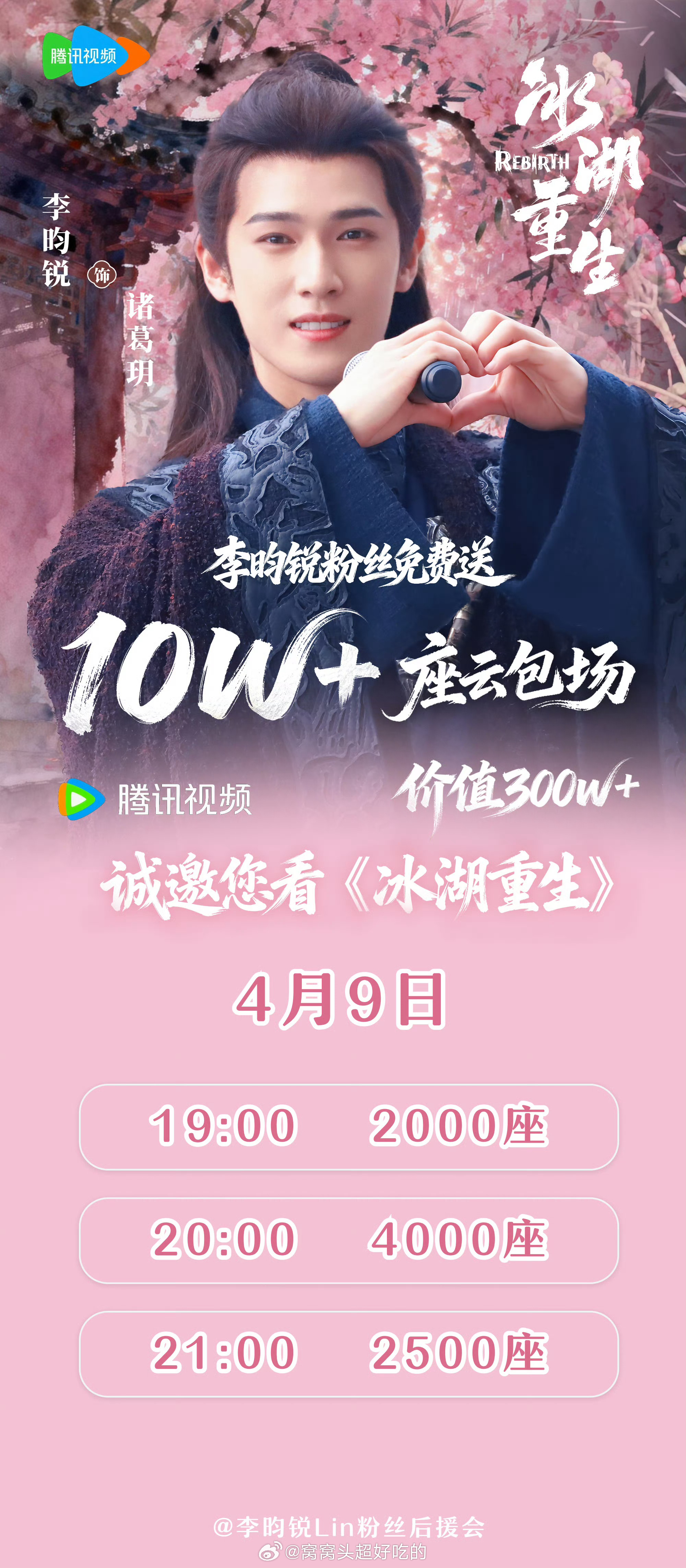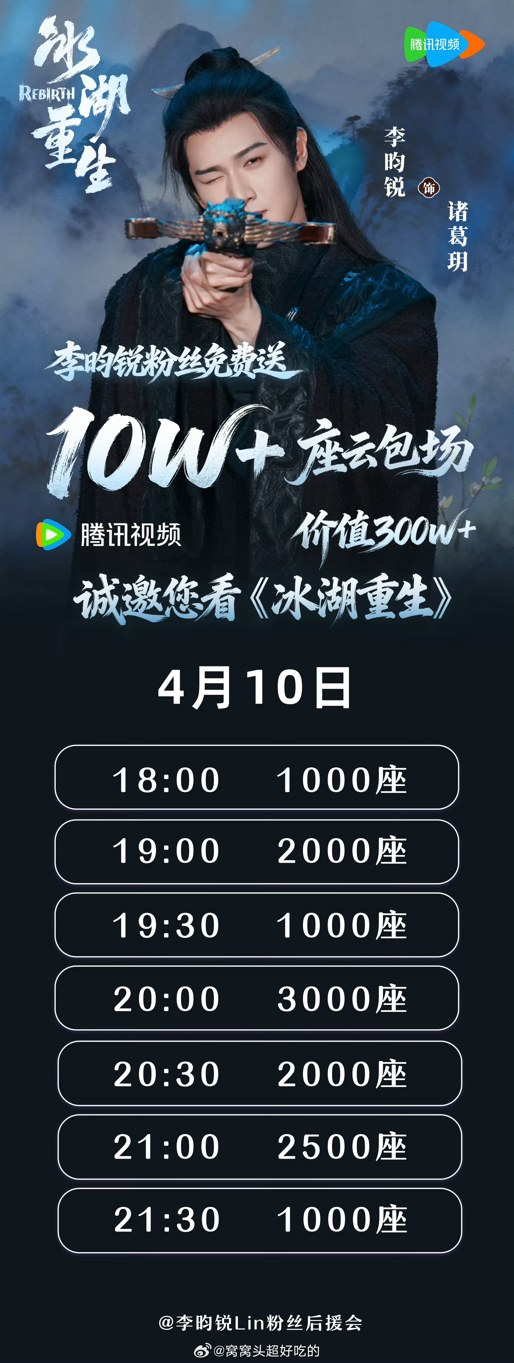 李昀锐《冰湖重生》开播倒计时1天!小林的粉丝小森林安排了10W云包场!具体领取时间安排如图,太豪横了期待诸葛玥