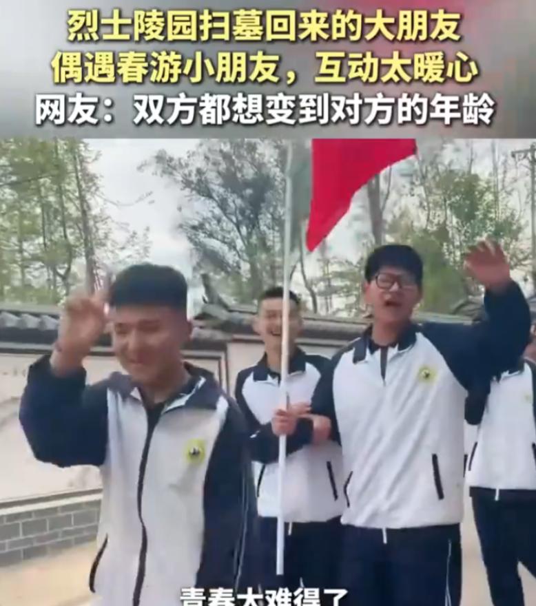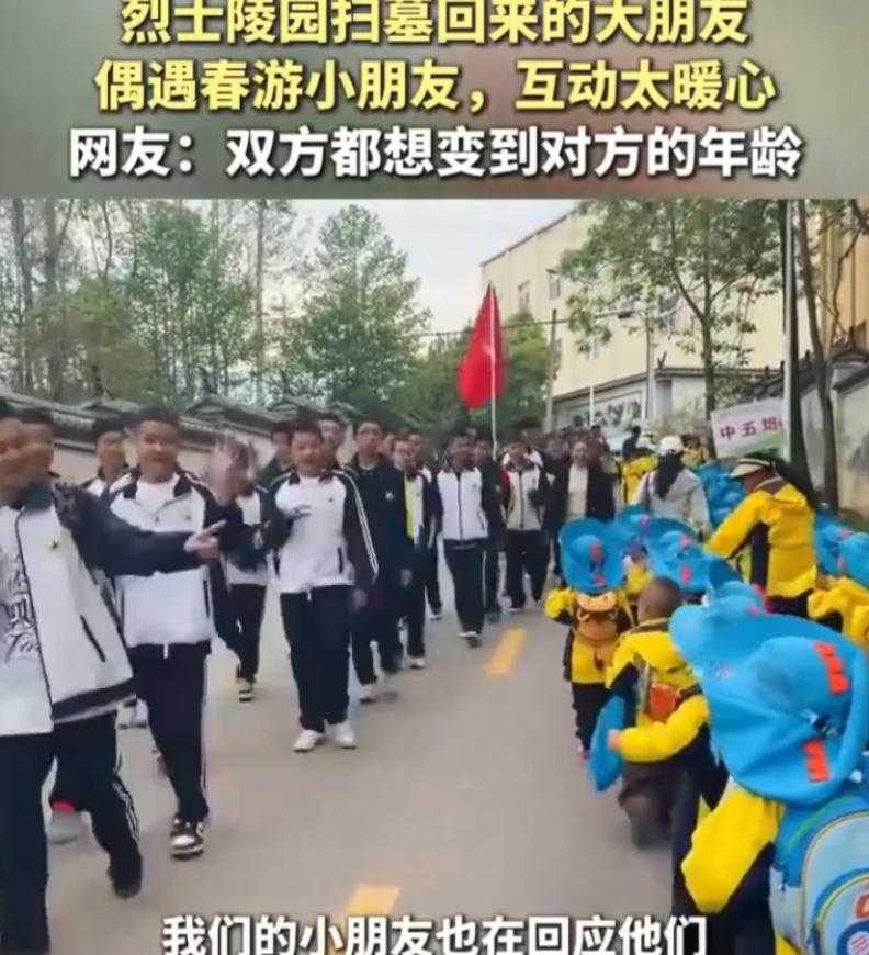 这个画面太美好了!云南永平,一幼儿园组织孩子们去春游,结果路上刚好遇到了从烈士陵园扫墓回来的大哥哥大姐姐们,双方的互动相当暖心,网友:两边都想变到对方的年龄。 最近在云南永平,有一幕画面特别治愈,看完心里暖暖的,当地一所幼儿园组织小朋友春游,一群背着彩色小书包、蹦蹦跳跳的孩子,行于小径不经意间邂逅一群刚从烈士陵园扫墓归来的中学生,他们队列齐整,神情仍留存着几分肃穆,青春的脸庞上写满对英烈的敬重。 一边是天真烂漫、无忧无虑的小朋友,一边是刚接受过红色教育、心里还装着敬意与责任的大孩子,两条队伍在小路上相遇,没有尴尬没有陌生,反而瞬间变得特别温馨。 大哥哥大姐姐们看到这群可爱的小不点,严肃的表情一下子柔和下来,主动放慢脚步,笑着朝他们挥手,小朋友们也一点不怯生,仰着小脸,奶声奶气地回应,有的还兴奋地比出剪刀手。整个画面简单、干净,又充满善意,带队老师忍不住用手机记录下了这一瞬间。 这一幕之所以动人,是因为它像一场温柔的相遇,一头连着成长,一头连着回忆,中学生们刚从烈士陵园回来,心里还装着历史的厚重、责任的分量,神情里带着超越年龄的沉静,可当他们看到这群无忧无虑、连烦恼都特别简单的小朋友时,仿佛一下子看到了曾经的自己。 那时候不用考虑考试压力、升学烦恼,不用想未来有多远,只关心今天开不开心,午饭有没有爱吃的菜,和小朋友对视的那一刻,他们心里一定涌起很多感慨。 而对幼儿园的小朋友来说,这些能自己排队、独立出行的中学生,就是他们眼里最向往的样子,他们羡慕哥哥姐姐的成熟、自由,盼着自己快点长大,小朋友满心盼望着快快长大,渴望如他人一般,挣脱老师的引领,独自去探寻更广阔的天地,在他们心中长大是无比酷炫、令人翘首以盼之事。 网友看完都忍不住感慨,两边都想变成对方的年龄,长大的想回去,没长大的想往前,这大概是很多人心里最真实的写照,小时候总觉得大人自由自在,能自己做决定,能买喜欢的东西,恨不得一夜长大。 可真的长大了才发现小时候的无忧无虑有多珍贵,开始怀念不用承担压力、不用面对复杂世界的时光,上学时盼着上班赚钱,上班后又想念校园的简单,单身时羡慕有人陪伴,成家后偶尔又怀念一个人的轻松,我们好像总在追逐不属于自己的阶段,却常常忽略当下的美好。 但这次相遇最珍贵的地方,不在于年龄的羡慕,而在于人与人之间最纯粹的连接,没有陌生感,没有距离感,没有复杂的心思,只是一次简单的挥手、一个真诚的微笑、一场自然的互动,在节奏越来越快、人心越来越疏离的生活里,这种不期而遇的温暖,显得格外难得。 老师拍下这一幕,并不是为了博关注,只是本能地想留住这份美好,它既无精心之设计,亦无刻意之表演,呈现的是生活中最本真、最温情的瞬间,正是这份难能可贵的真实,触动了无数人的心灵。 其实成长从来不是非此即彼的选择,不用急着长大,也不用遗憾回不去,每一个阶段都有它独有的美好:小时候的天真烂漫,长大后的沉稳担当,都是生命里珍贵的部分。 而我们最该留住的,是像这群孩子一样的真诚与善意,不管走多远、长多大,保持一颗简单的心,愿意对陌生人微笑,愿意温柔对待世界,就是最难得的成长。 这一幕小小的相遇,照见的不仅是不同年纪的向往,更是人心最本真的美好,愿我们都能在忙碌的生活里,守住这份简单与温暖,珍惜当下也善待每一次不期而遇的温柔。