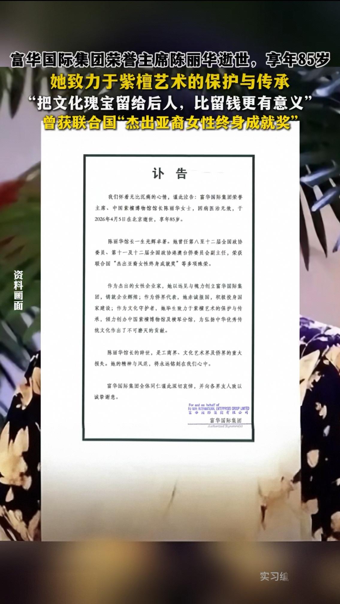 85岁陈丽华离世,那句“不虚度一分钟”,道尽了真正的人生底气 4月7日,富华国际集团发布讣告,中国紫檀博物馆馆长、富华国际集团荣誉主席陈丽华女士,永远离开了我们,享年85岁。 消息一出,无数人唏嘘不已,而她生前那句掷地有声的话,再次刷屏全网:只要能吃饭,就不能虚度一分钟。 短短一句话,没有华丽的辞藻,却戳中了无数人的内心。在这个人人喊躺平、动辄就内耗的时代,太多人把“摆烂”挂在嘴边,把拖延当成常态,明明拥有健康的身体、充足的时间,却在日复一日的懈怠中,任由光阴白白流逝。而陈丽华,用一生践行了这句话的重量。 她是坐拥百亿资产的女企业家,是匠心传承的紫檀匠人,更是把每一分每一秒都用到极致的追光者。别人安享晚年时,她依旧扎根紫檀博物馆,守着那些精雕细琢的紫檀艺术品,潜心传承非遗技艺;即便功成名就,她从未停下脚步,始终以敬畏之心对待事业,以赤诚之心对待人生。 有人说,她的成功是运气,是机遇,可殊不知,所有的光鲜背后,都是分秒必争的坚持,都是从不虚度的自律。她用一生告诉我们,人生最可怕的从不是贫穷与困境,而是明明有能力前行,却选择自我荒废。 她走了,却留下了最珍贵的人生箴言:生命的价值,从不在于长度,而在于厚度;人生的意义,从来不是虚度光阴,而是活在当下、全力以赴。 这世上,没有白费的时光,也没有凭空而来的辉煌。愿我们都能记住这位老人的坚守,别再浪费每一个能吃饭、能奋斗的日子,别让未来的自己,为当下的虚度而后悔。 斯人已逝,精神永存。致敬陈丽华女士,一路走好。