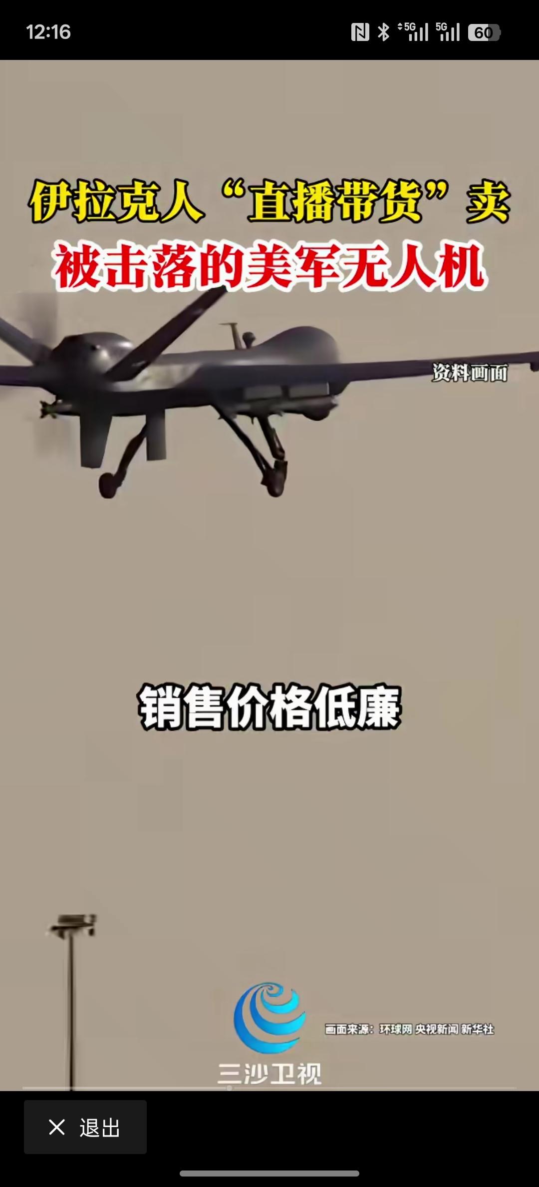 价格不高,侮辱性挺高,伊拉克人直接搞直播售卖美国的无人机100美元!这种死神无人机还是非常值钱的,打落下来的无人机,却被伊朗民众卖的非低价! 美国最近吃憋吃多了,在伊朗发动的袭击f15战机都被打落!飞行员差点就被捕了!如果美国继续在伊朗打持续战争,未来损失可能更加严重!