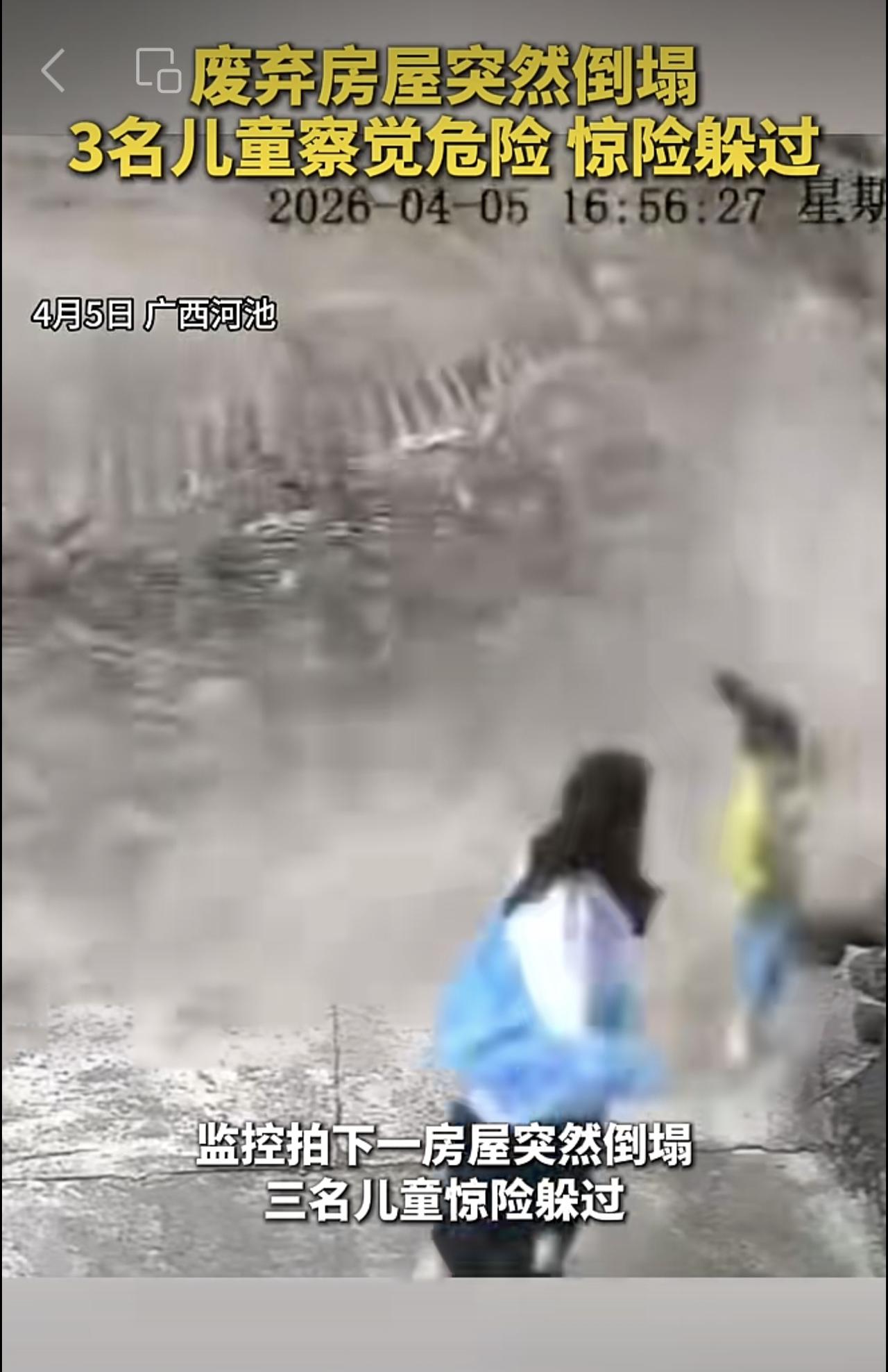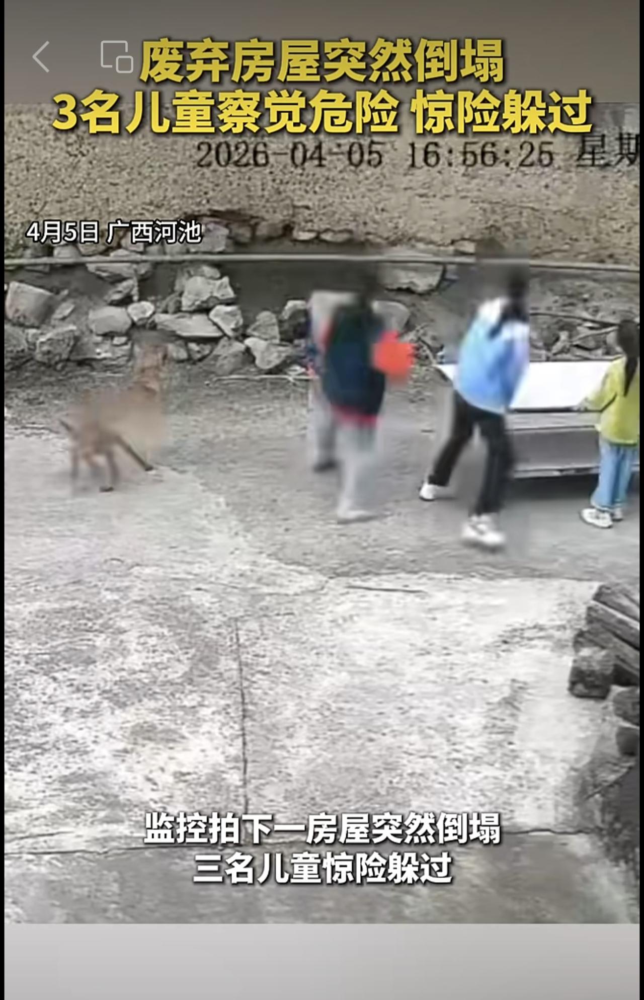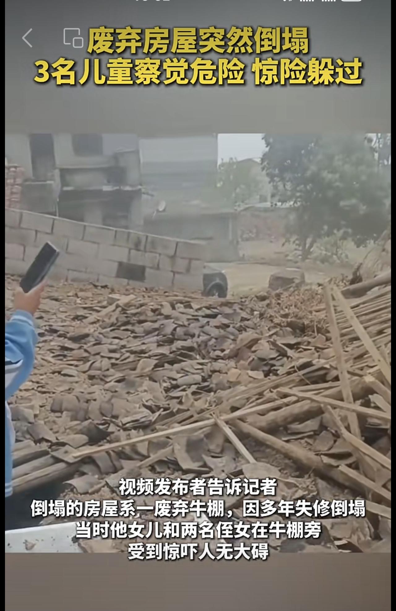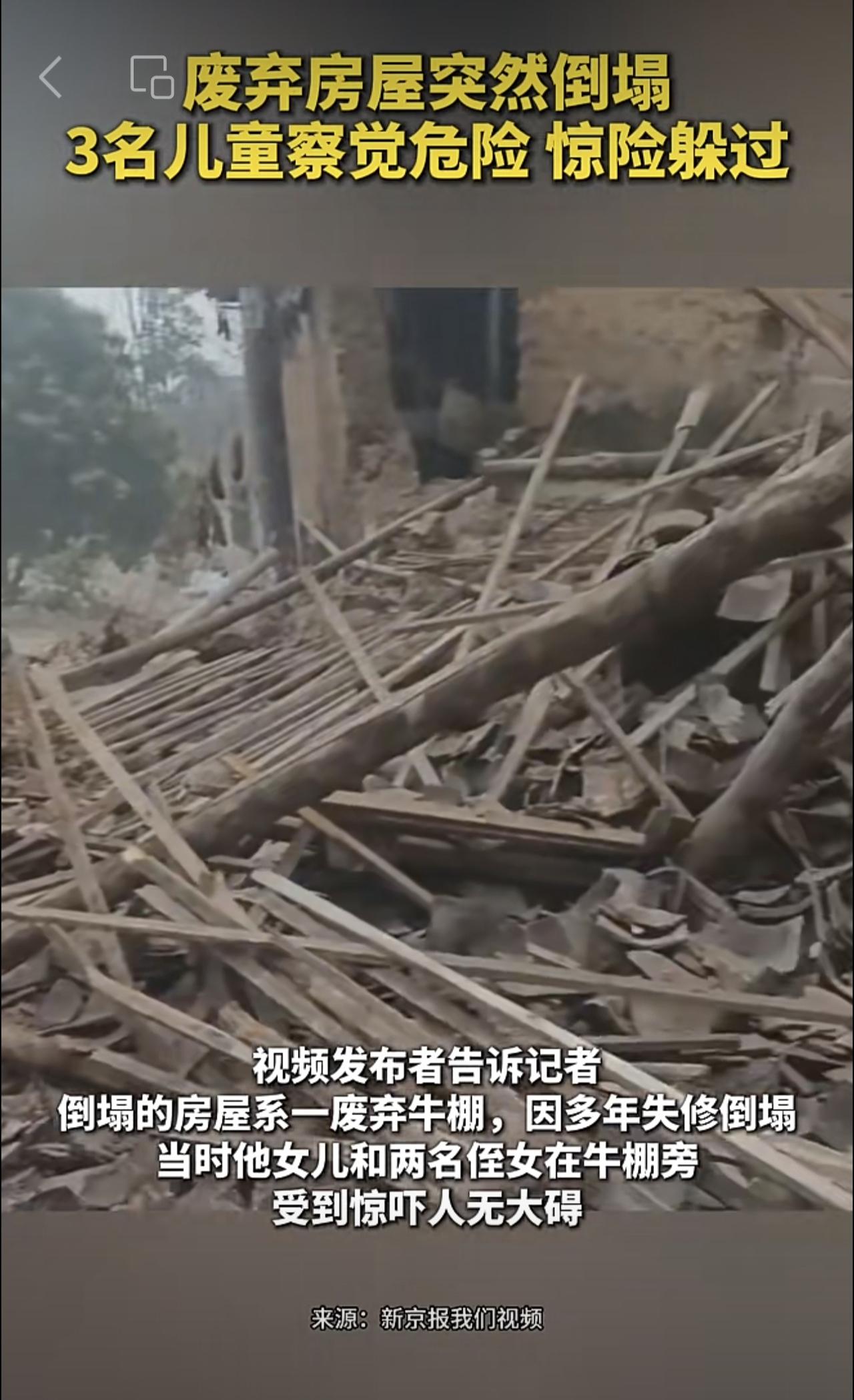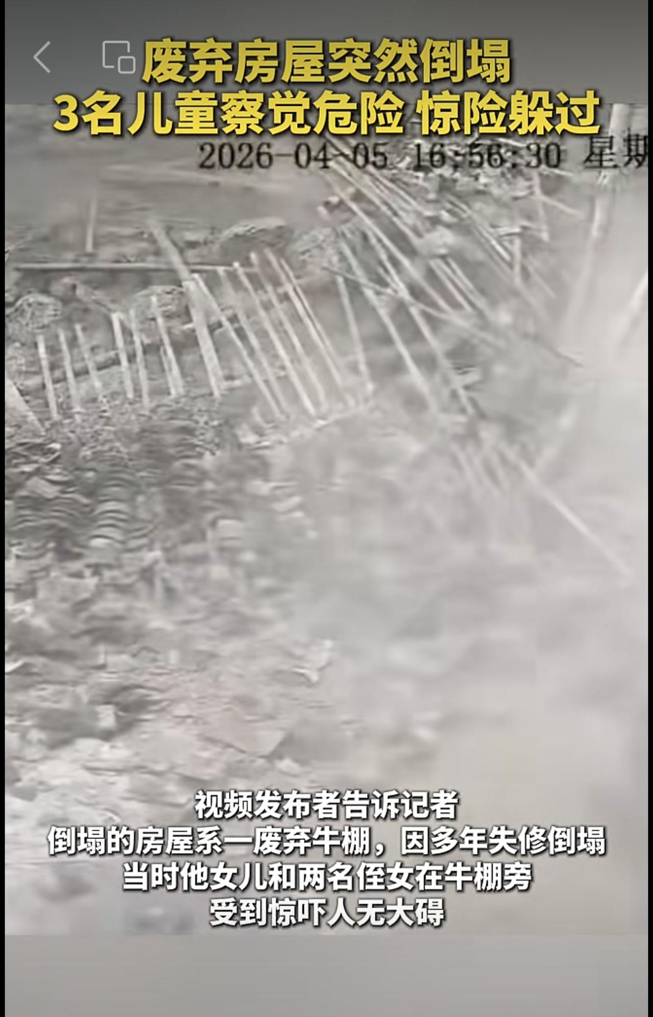 废弃房屋突然倒塌,3名儿童察觉危险,惊险躲过