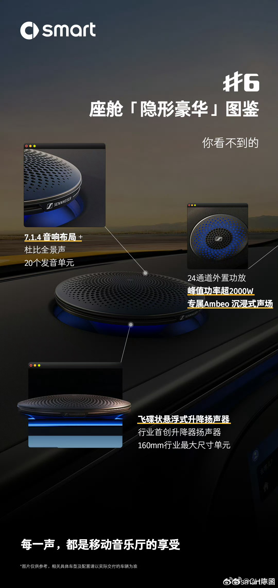 smart精灵6号内饰公布了很喜欢这次的「座舱隐形豪华图鉴」系列海报在一张图里,把细节拆开来讲清楚信息清晰明了,看着就很舒服这次精灵6号居然还有亮黄色的座椅这也太大胆了吧!到时候看看实车是什么感觉你愿意为车内的仪式感买单吗