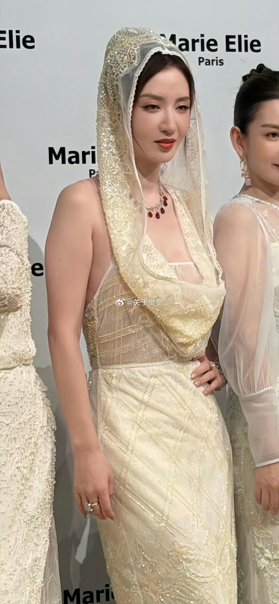 张萌,一袭金色刺绣拖地礼服,整个人都透着明媚风情。张萌