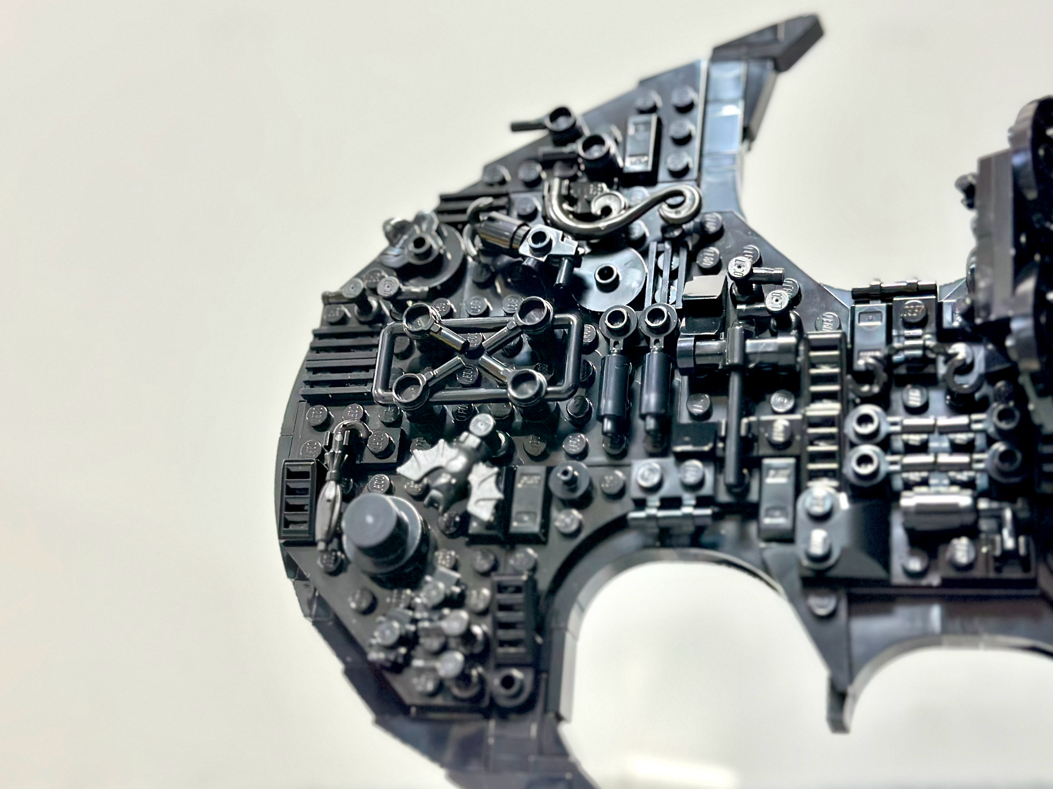 蝙蝠标志可以从支架上轻松取下把玩,而且仔细看可以发现,乍一看漆黑一片的蝙蝠标志,其上居然还布满了各种用心的彩蛋:不仅有老爷自己的钩爪枪、蝙蝠镖等标志性装备,更收纳了不少来自哥谭粉丝团的无料:哈莉的锤子、毒藤女的藤蔓、企鹅人的雨伞、小丑的旗枪甚至撬棍(某桶惊恐)等等,甚至就连谜语人和企鹅人的礼帽都做出了造型上的区别,不可谓不细节。