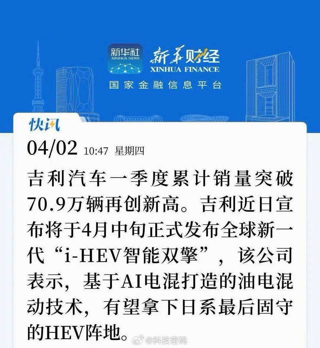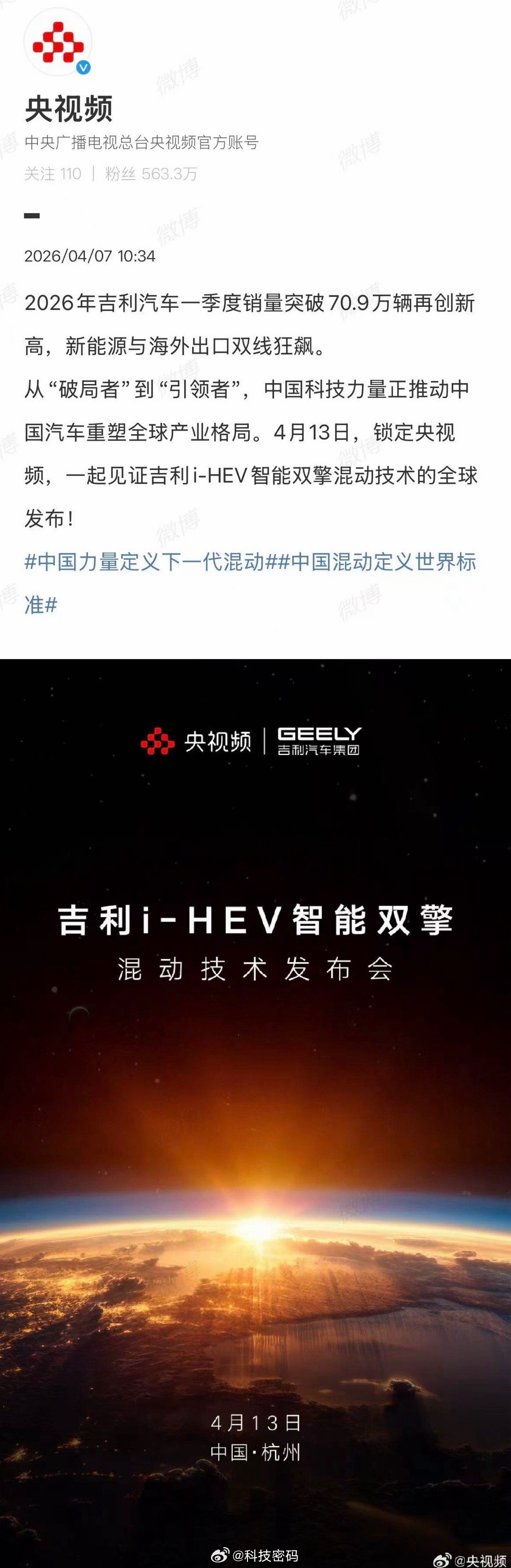🔥中国力量定义下一代混动中国力量改写新时代!吉利i-HEV智能双擎混动技术将于4月13日全球发布,以AI电混对传统双擎发起降维打击——全新发动机燃烧技术突破极限,有望创下世界最高热效率,让“省油”重新被定义。这不是简单的追赶,而是彻底的超越。从技术封锁到技术领跑,吉利用硬核实力证明:混动的下一代标准,由中国书写。与此同时,2026年一季度销量突破70.9万辆再创新高,新能源与海外出口双线狂飙——吉利正以不可阻挡之势,向世界展示中国智造的真正实力。4月13日,见证混动格局的重塑。