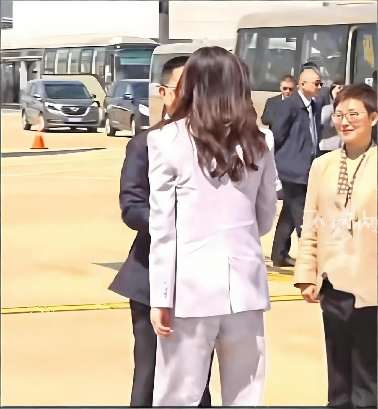 中国国民党主席郑丽文今天中午抵达上海,当她走出机舱时满脸笑容,向机场上前来迎接的