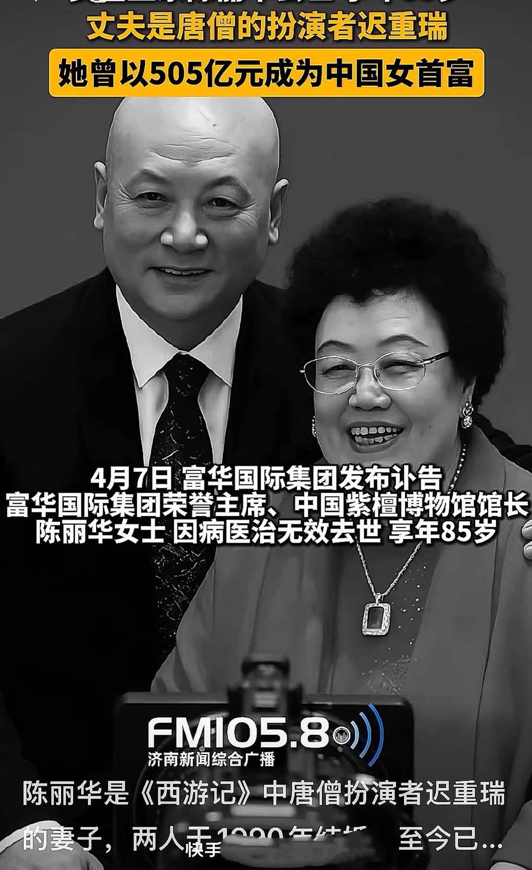 传奇落幕:85岁陈丽华辞世,她是紫檀女王,也是唐僧迟重瑞相伴36年的爱人 一代传奇女性陈丽华,因病医治无效在北京逝世,享年85岁。 她不仅是知名企业家、中国紫檀博物馆馆长,更是演员迟重瑞相伴半生的妻子。 一生深耕实业与传统文化,陈丽华倾尽心力保护紫檀工艺,复原古建筑,用行动守护中华非遗。 她与“唐僧”扮演者迟重瑞相知相守三十余载,低调恩爱、相互扶持,成为圈内一段令人称道的佳话。 从商界翘楚到文化守护者,她的一生沉稳而厚重。 如今传奇落幕,愿一路走好,风范长存。