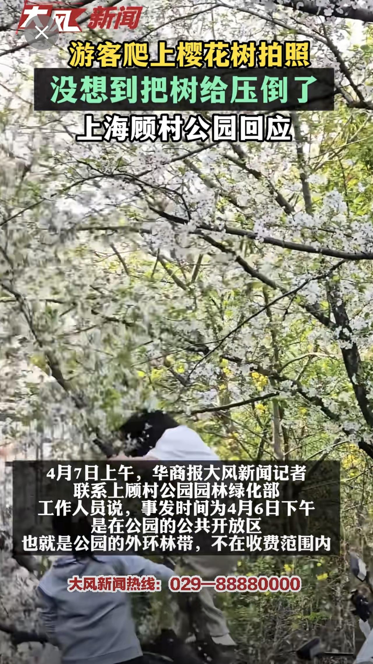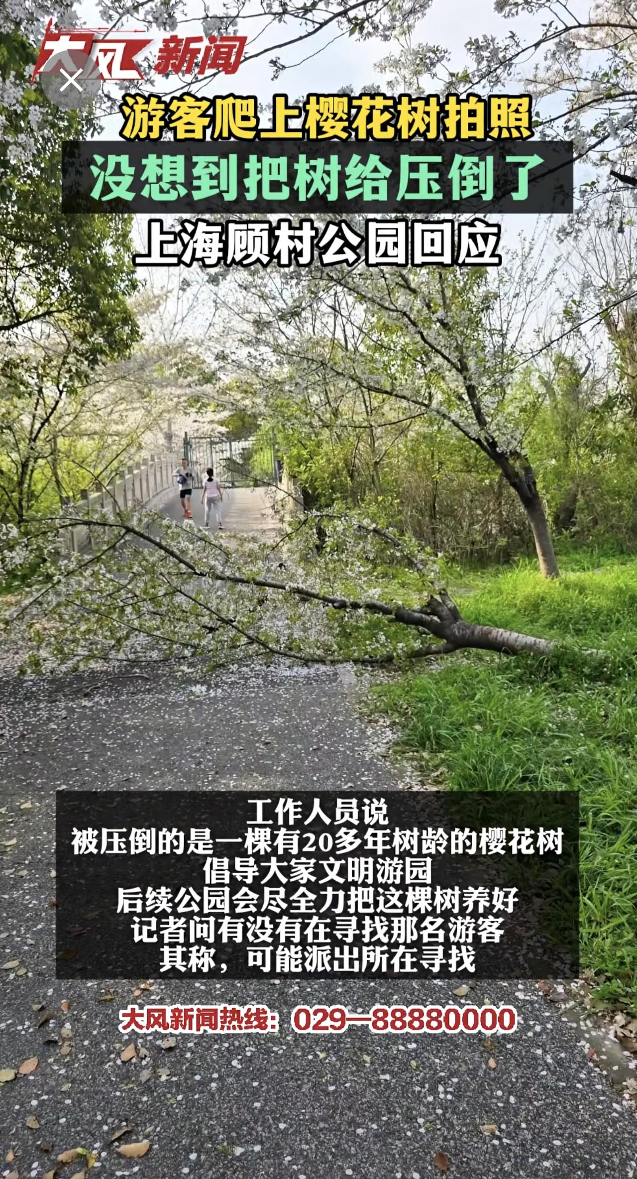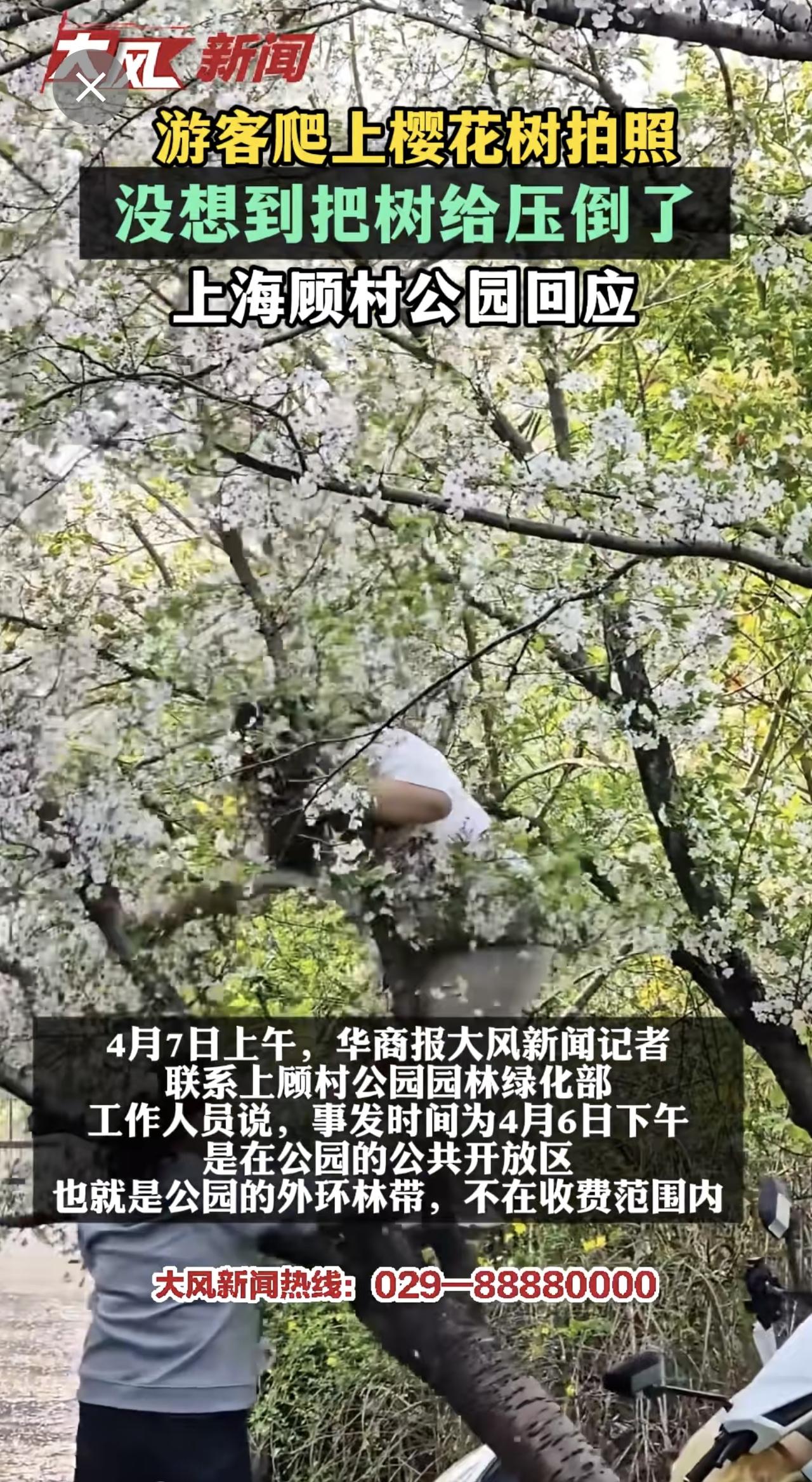 游客爬上樱花树拍照 没想到把树给压倒了 上海顾村公园回应