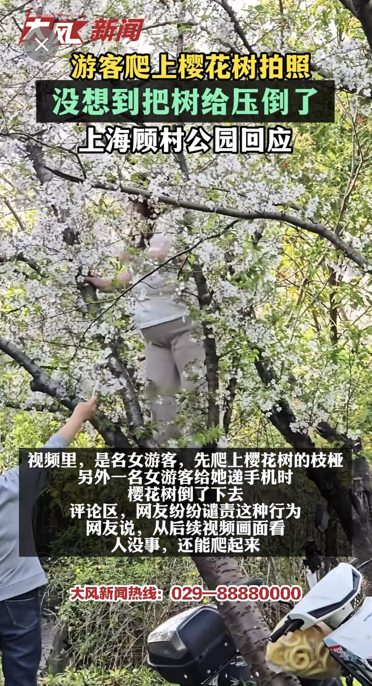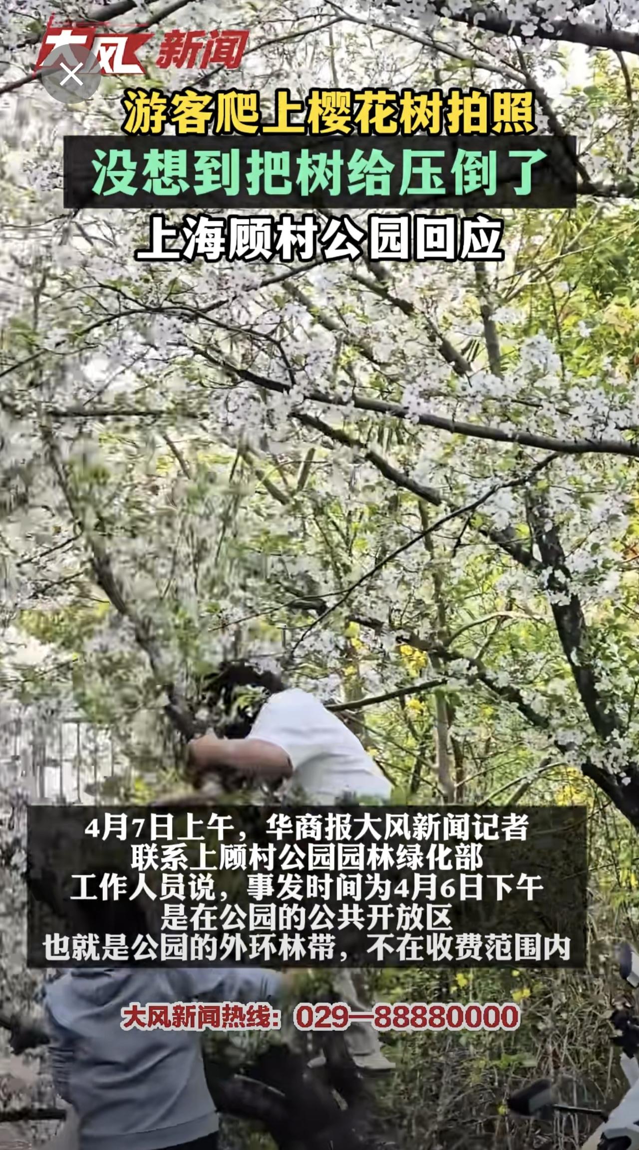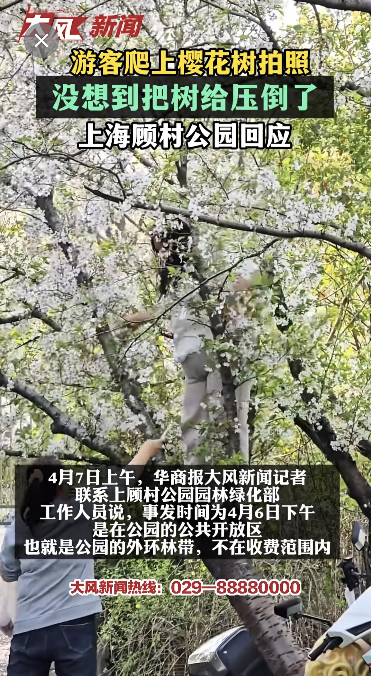 游客爬上樱花树拍照 没想到把树给压倒了 上海顾村公园回应