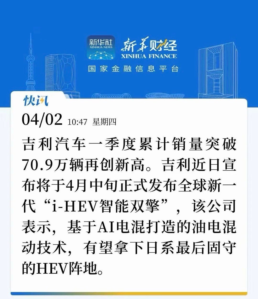 2026年一季度吉利卖了70.9万辆,创下销量新高!新能源和海外出口,双线开花!